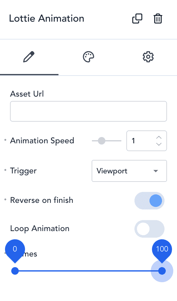 Breakdance has a native visual block for Lottie files. To use it, drag the element from the visual builder into your content area. Use the animation library to find an asset URL, simply paste it into the block, and your element should be good to go