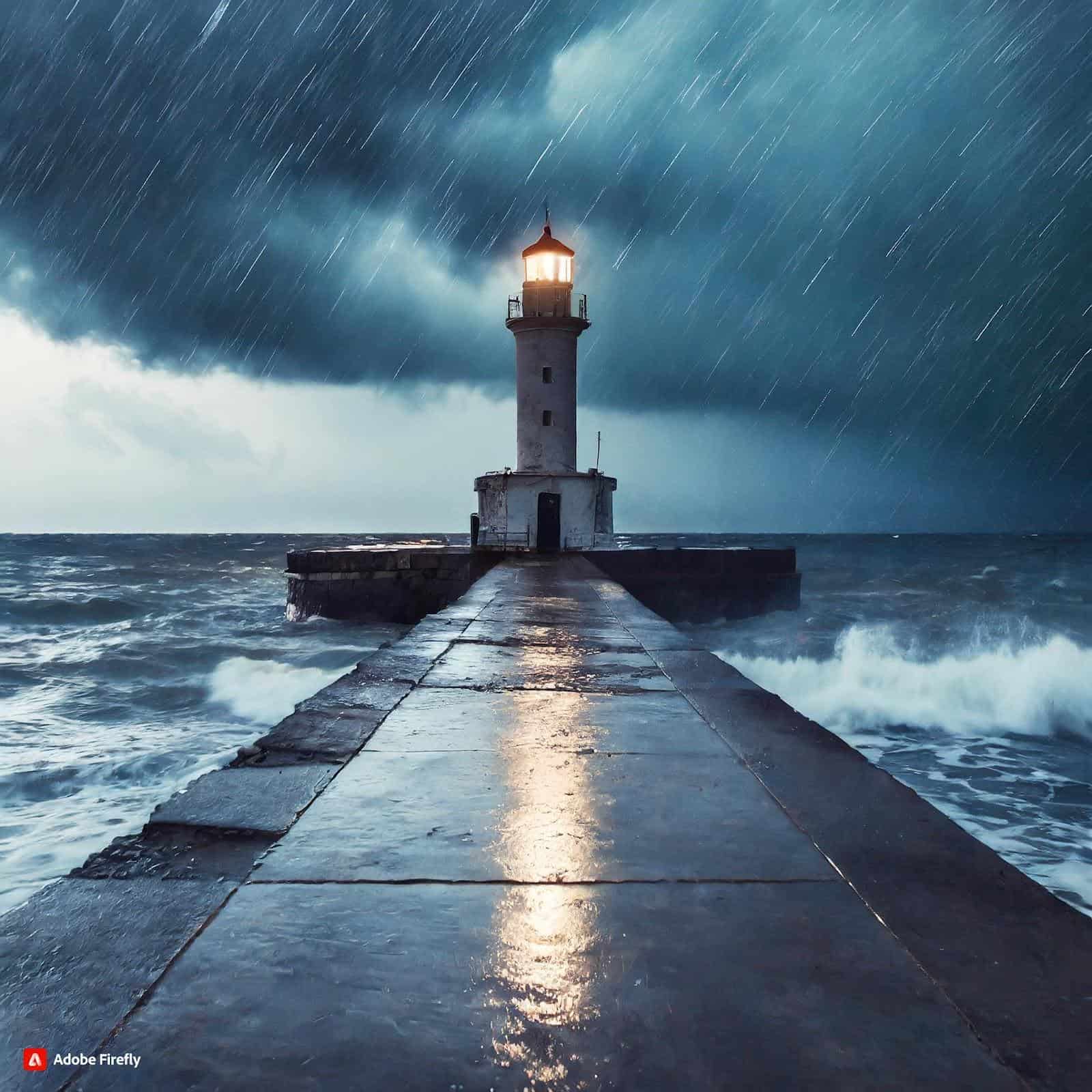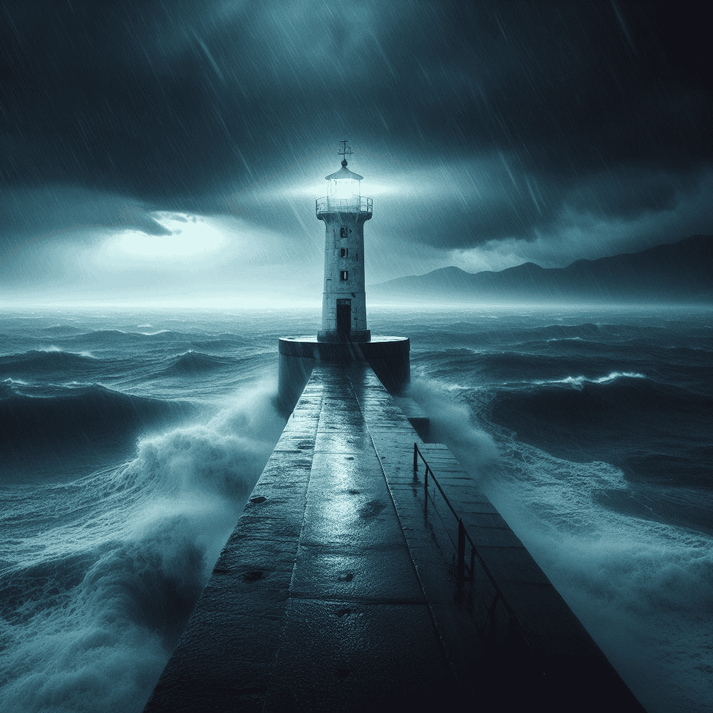Prompt: a lonely lighthouse sits at the end of the pier, stormy weather, night