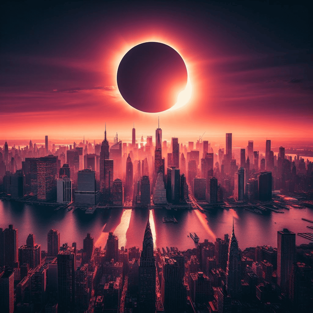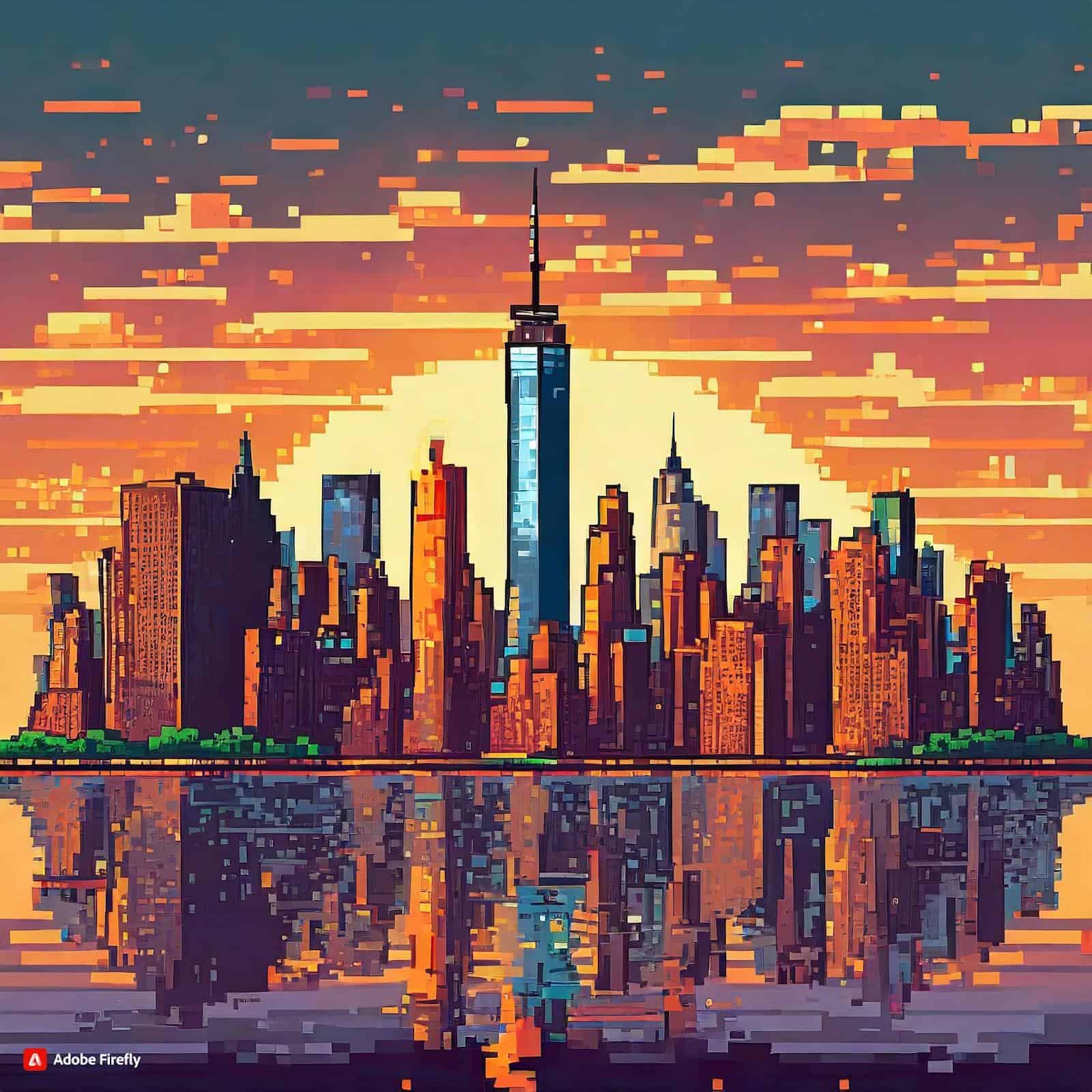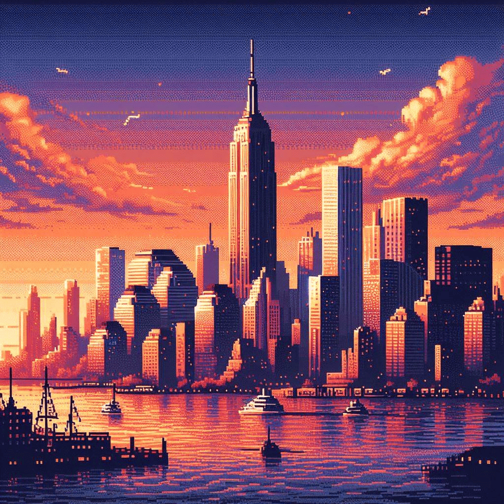 Prompt: pixel art scene, new york skyline during sunset, 8-bit