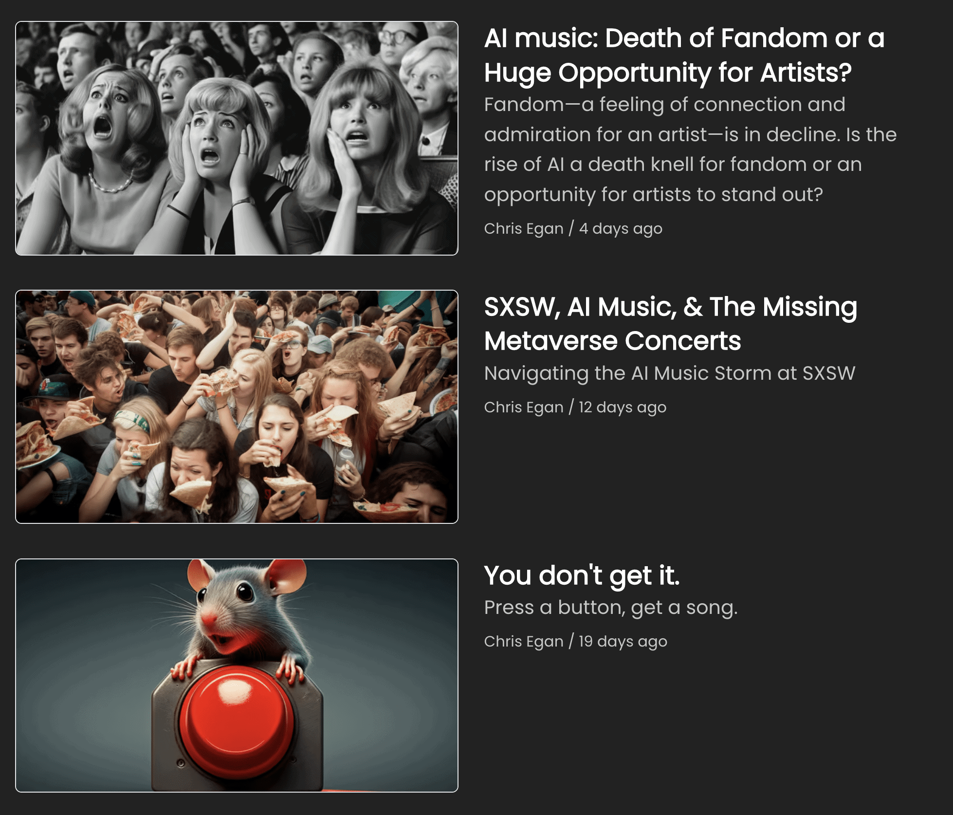 The creator of Music Futurist writes specific to how music is being disrupted through Artificial Intelligence. Chris Egan writes about things like clicking buttons to produce music, philosophical questions about music in AI, and competition in AI songwriting (cool, right?)