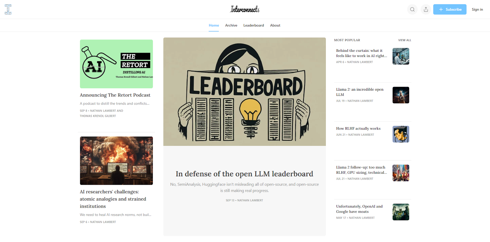Overview: Interconnects is a long-form newsletter aimed at providing the latest news and serious opinion pieces. Since the writer is a machine learning engineer by day, you can expect comprehensive deep dives into the latest developments in the realm of AI.