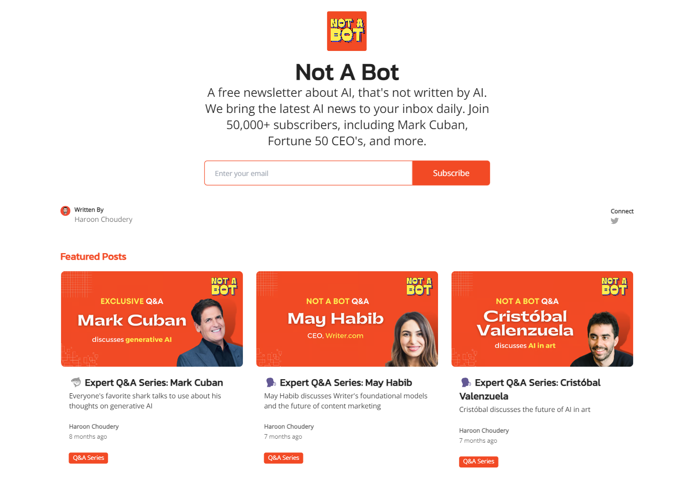 Overview: Not A Bot is a free newsletter about AI, not written by AI. It’s a standout newsletter with over 50000 subscribers that features a mix of articles, opinion pieces, and interviews with experts in the field. And, if you’re ever in doubt of their credibility, Not A Bot has also solidified its reputation as one of the best newsletters in the AI field by bringing in heavy-hitting industry guests like Mark Cuban.