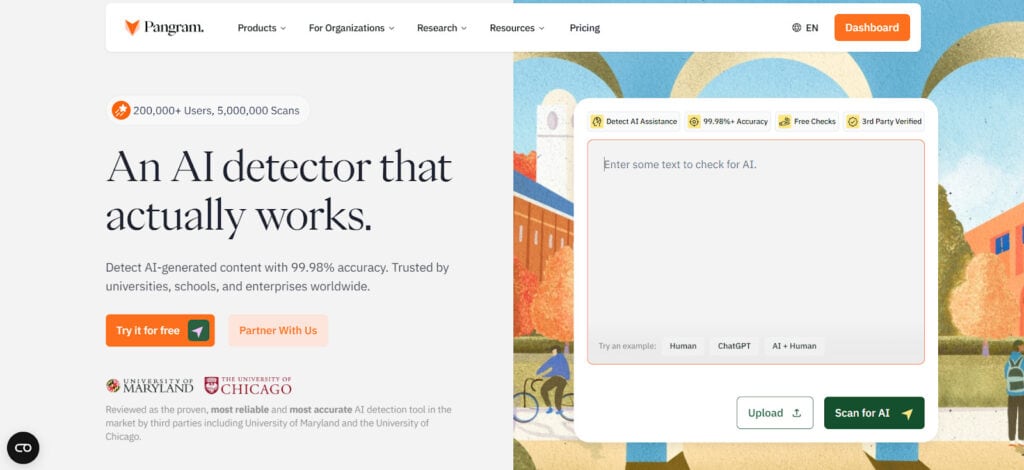 Pangram is one of the tools that keeps surfacing in university-level discussions. Articles and studies referenced by places like the University of Chicago and the University of Maryland suggest Pangram performs competitively against other major detectors, especially when the writing has been paraphrased or “humanized.”