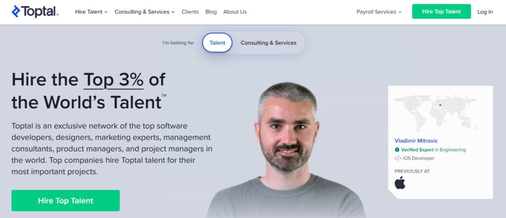 Toptal's "top 3% of talent" claim has been around for years, and while I'm skeptical of exact percentages, the vetting is genuinely rigorous. You typically get matched within 48 hours.