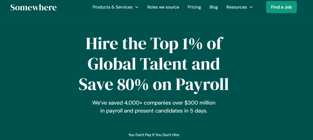| Somewhere | First overseas hire | 25 to 35% of salary | One-time fee | 2 to 3 weeks | Global |