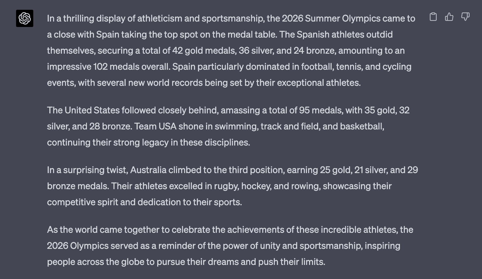Go ahead. Try to ask ChatGPT to write you a paragraph on the results of the 2026 Olympics. If it's in the mood, you'll see some crazy believable statistics. It's not true of course, but that's just how these tools are designed. It makes predictions based on what it knows. It'll look real, but it won't be.