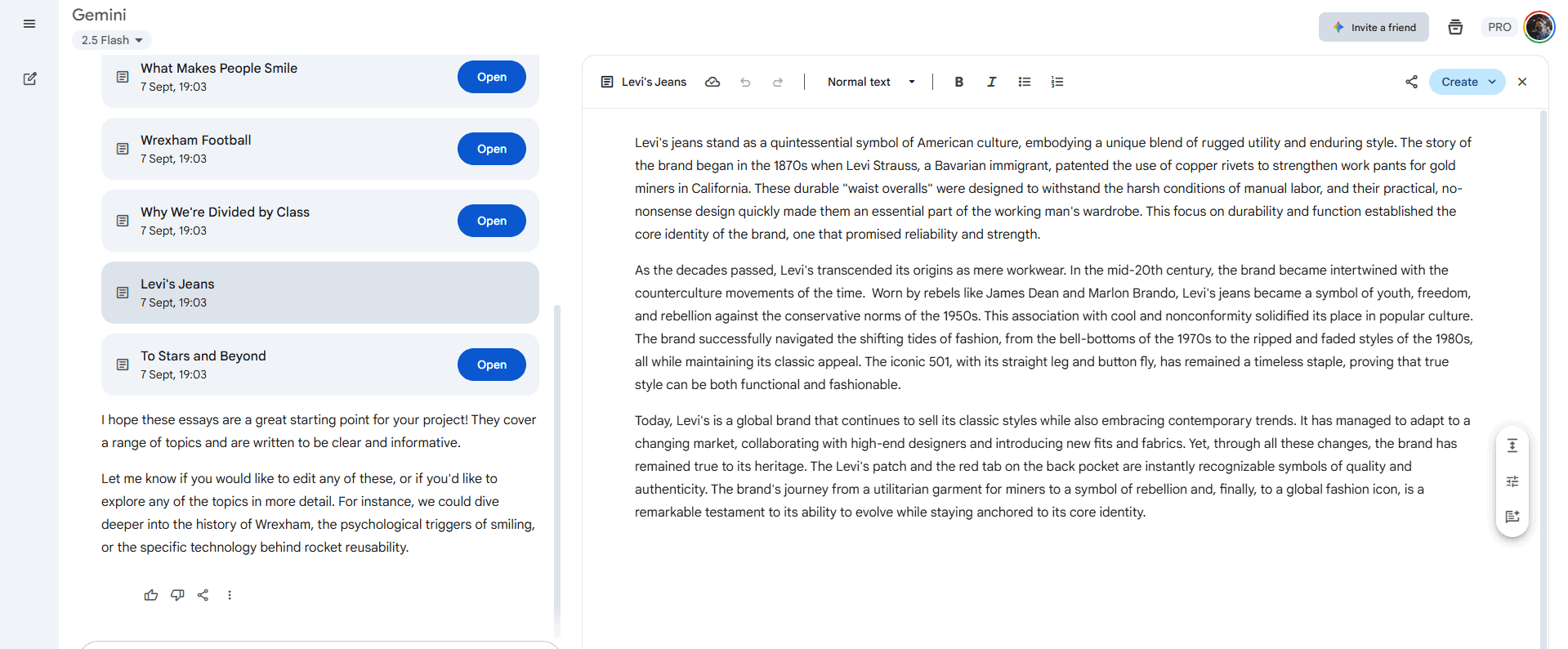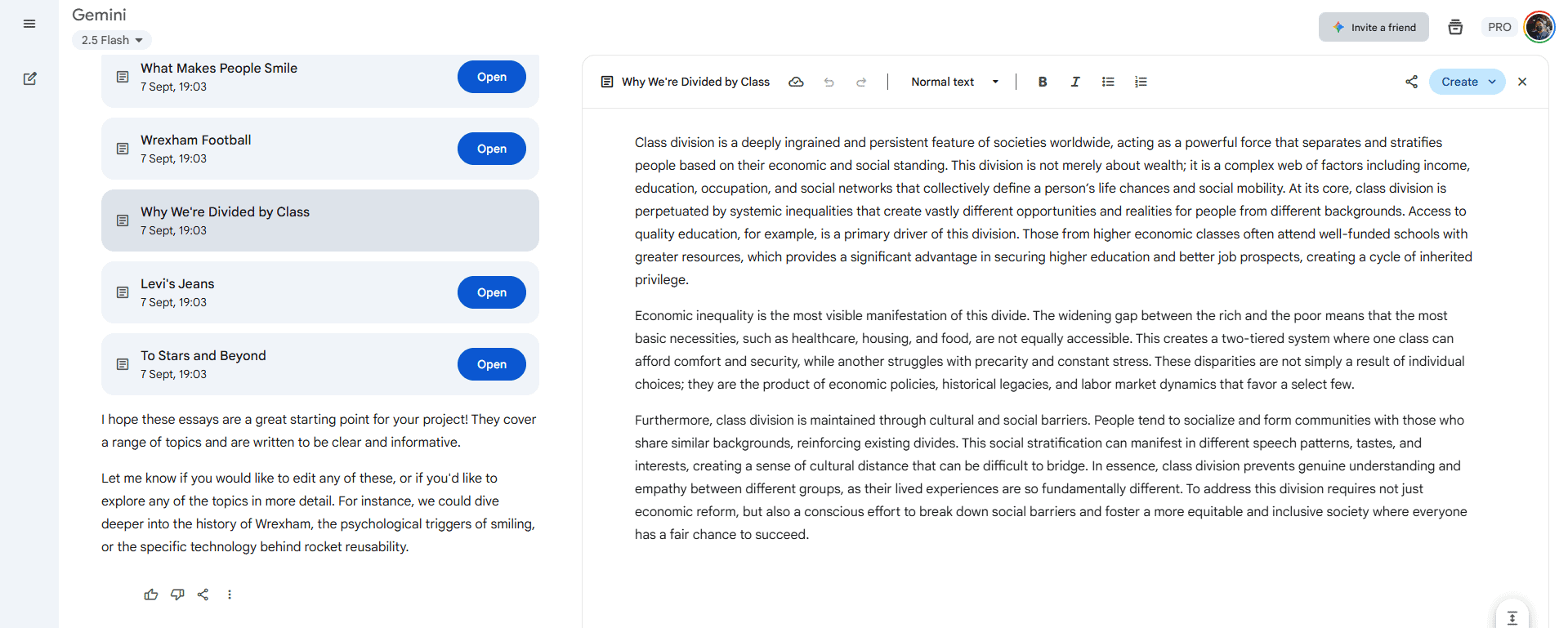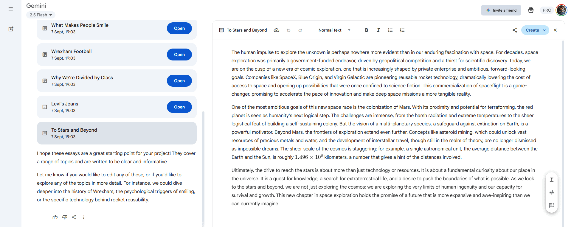 - Natural Flow – Gemini’s writing often avoids the robotic stiffness earlier models struggled with. It uses smoother transitions, more varied sentence lengths, and even a casual tone when the prompt calls for it.