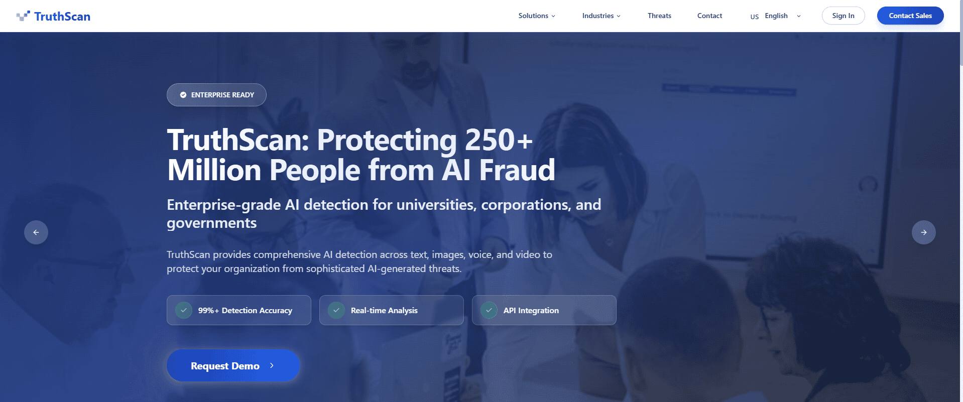 TruthScan isn’t a one-trick tool. It’s a comprehensive AI detection suite covering text, images, video, audio, email scams, and real-time monitoring. On the text side, it promises 99%+ accuracy, with detection speeds under 100 milliseconds and enterprise-grade reporting.