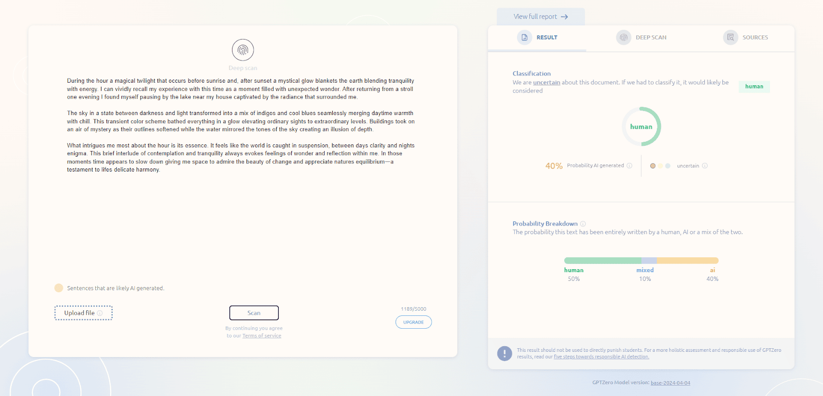 GPTZero is an AI detection tool developed by researchers at the University of Maryland. This platform analyzes the linguistics and writing patterns of a given text to estimate the probability that it was generated by an LLM. It does so by dissecting elements like word distribution, filler words, context inconsistencies, and more.