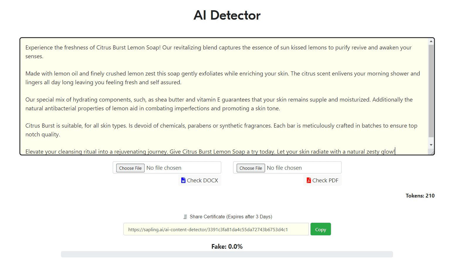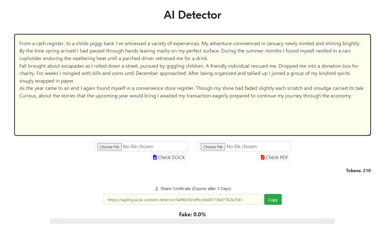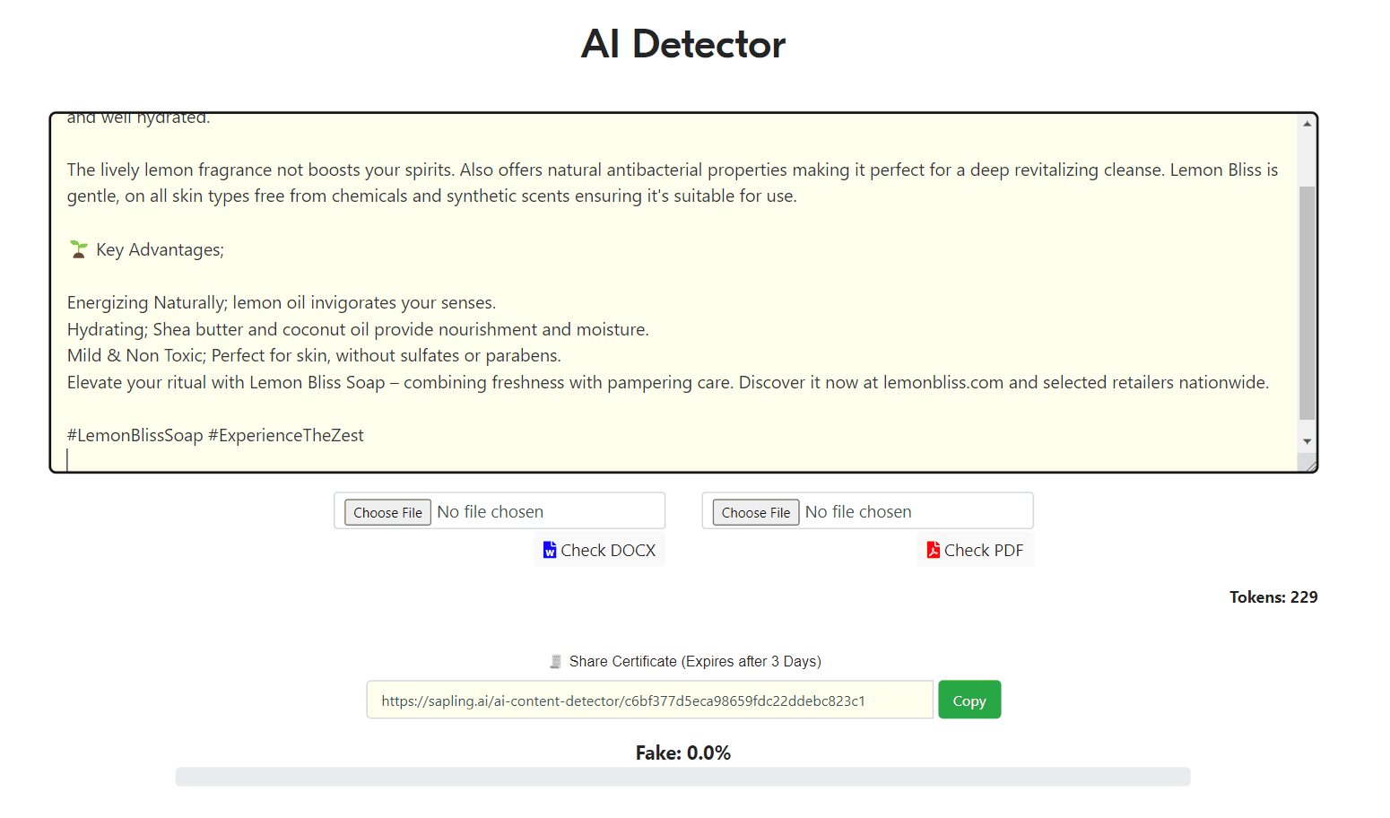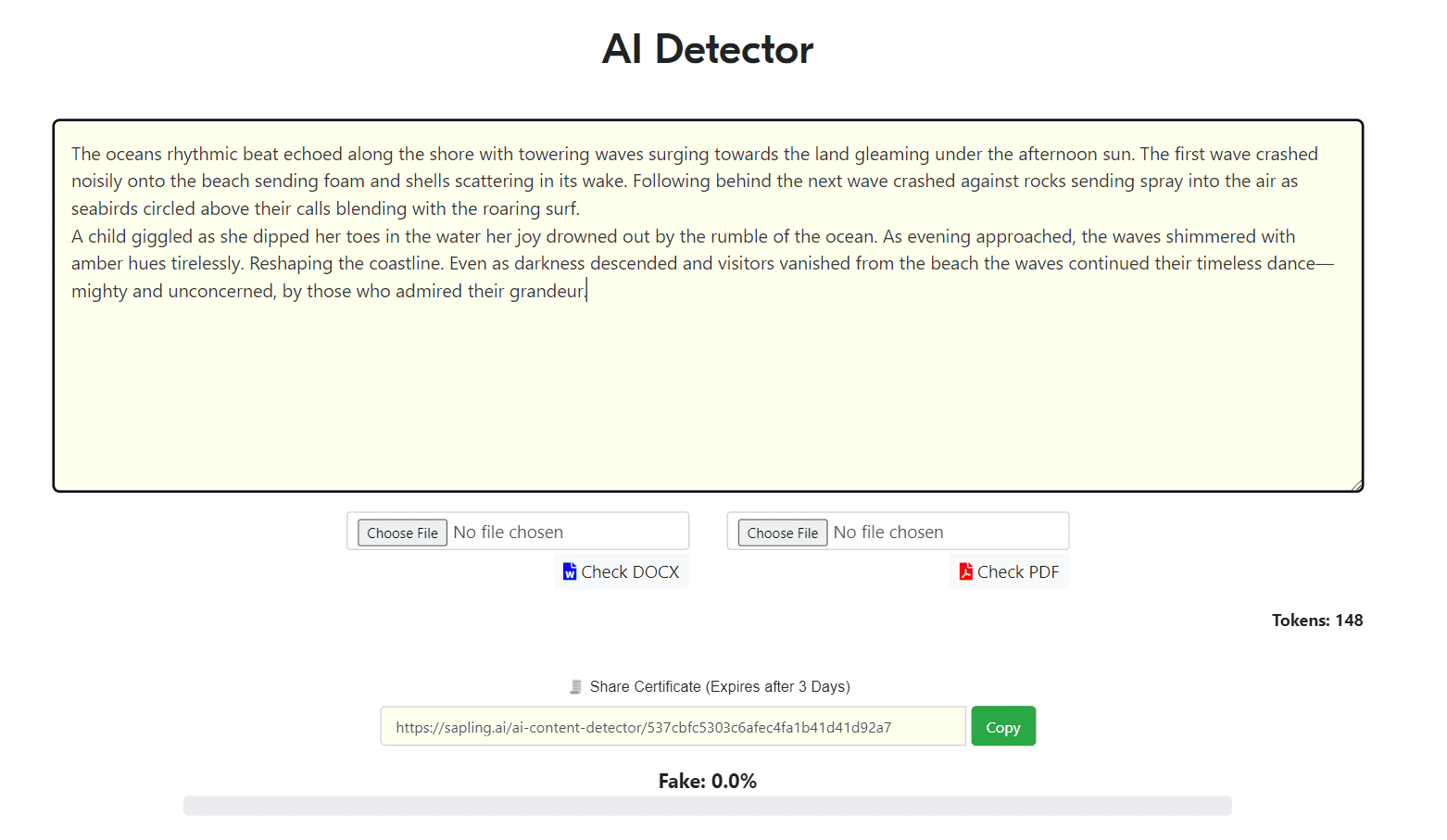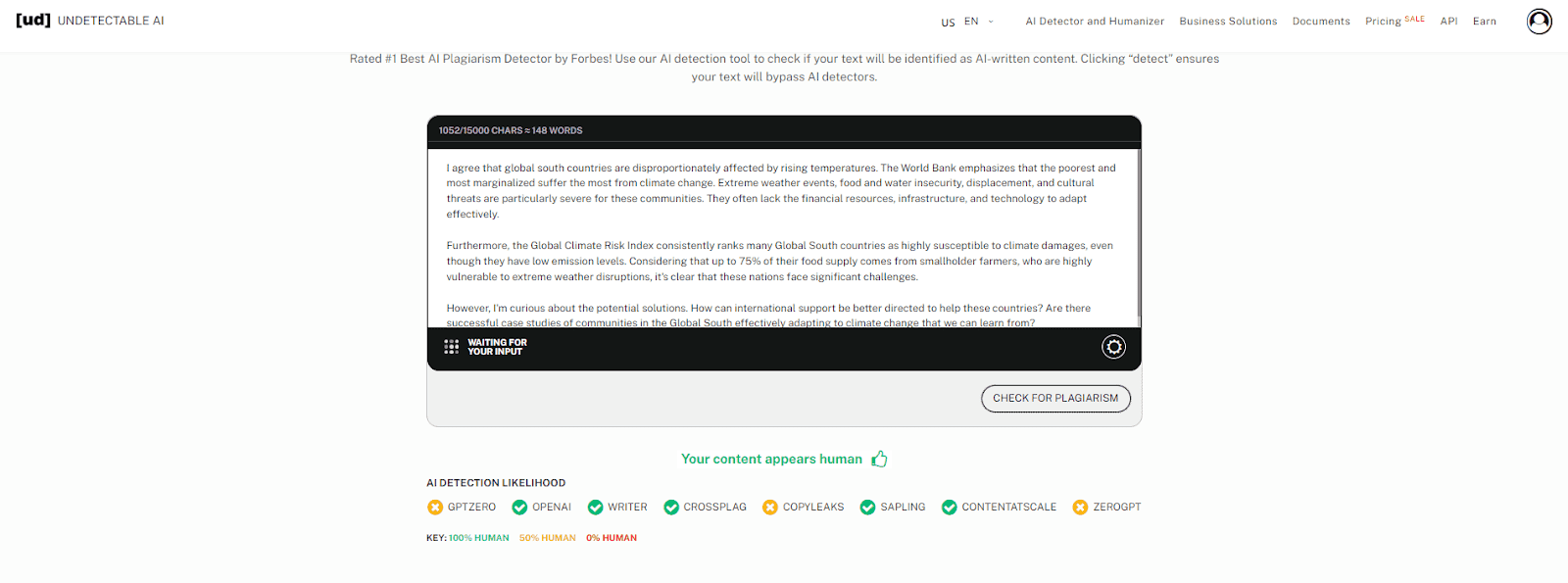 In this test, I’ll use the same prompts for Claude and ChatGPT, tweak their respective outputs using Undetectable AI, then get an AI likelihood score from Sapling AI. Here’s the result:
