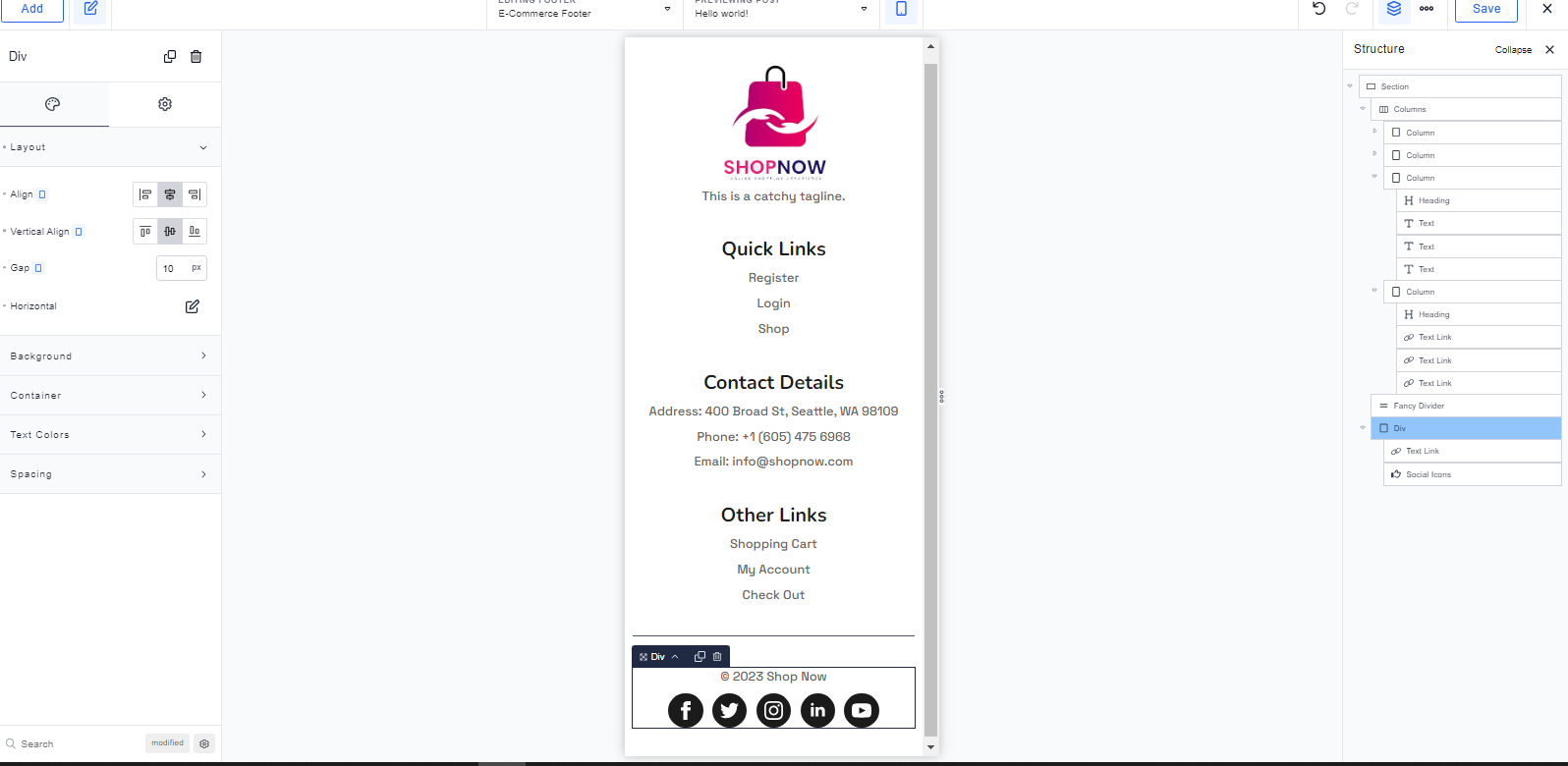 Under the parent section, go ahead and add Div. Then under Div, add two elements - one for the copyright text and another for the social media icons.