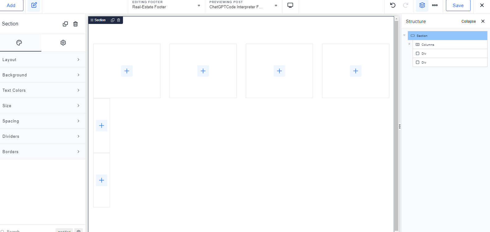 2. Within the parent section, add a four-column element. These columns are reserved for the footer’s navigation links.