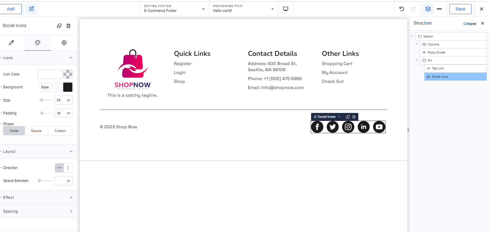As with the other elements above, make sure to adjust the font size, background color, icon styles, and spacing to your liking. Your footer should now look similar to this.