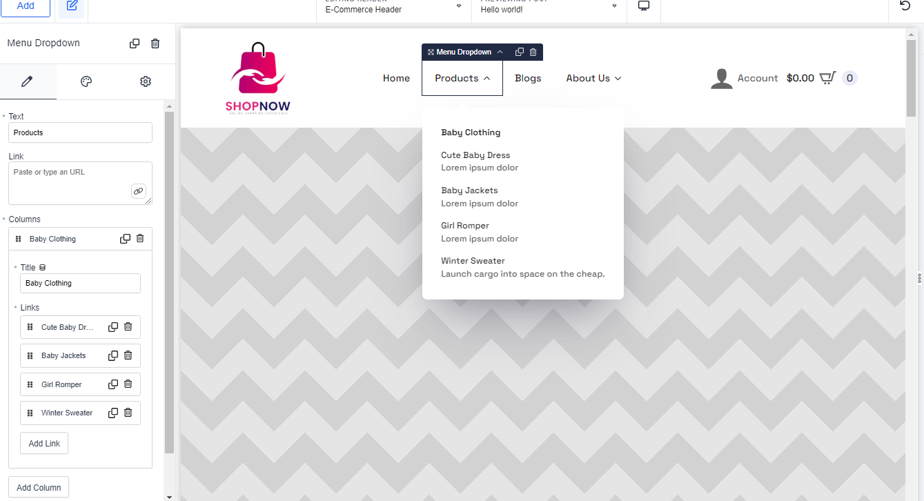 8. Update the texts on your menu links. To edit the content of the Products dropdown menu, click columns and edit the title and links.