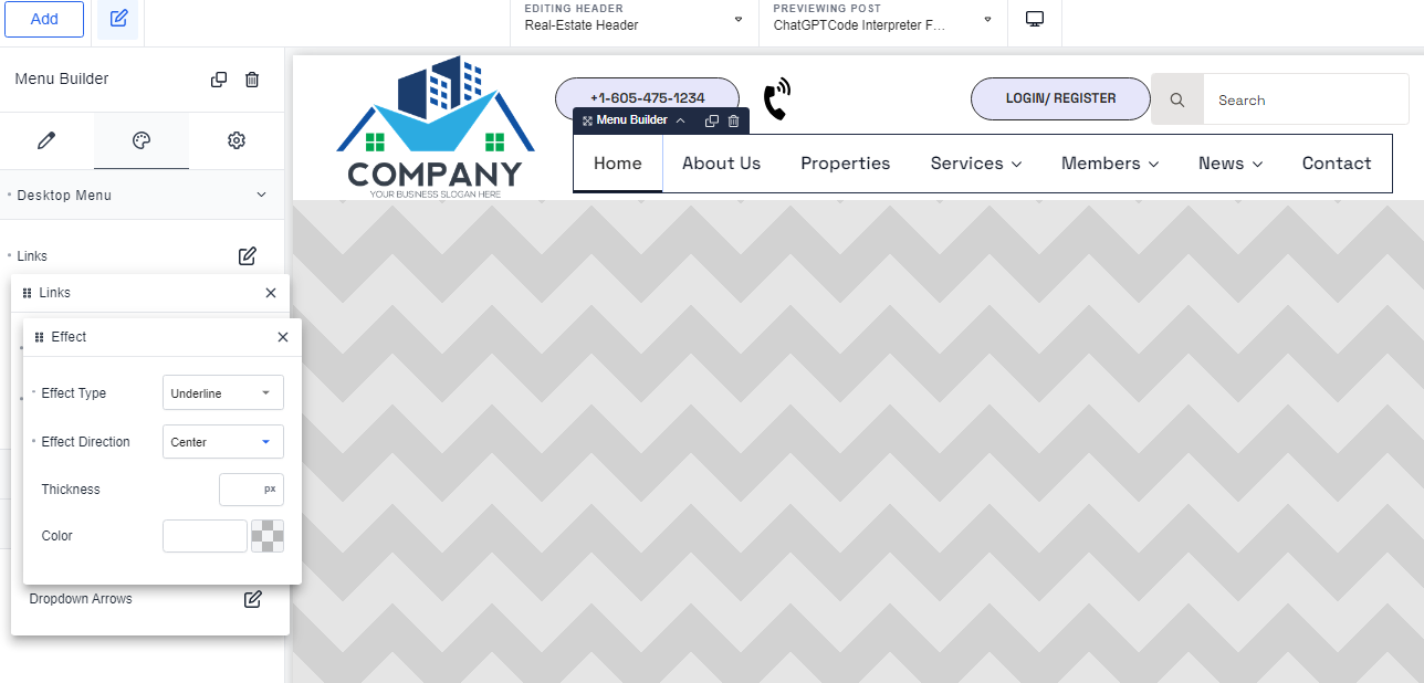 You can also add effects when you hover over the menu. Here, I’v added the underline effect on the menu links. To do this, go to Style tab > Links > Effect. Choose ‘Underline’ for the ‘Effect Type’ and ‘Center’ for the ‘Effect Direction.’