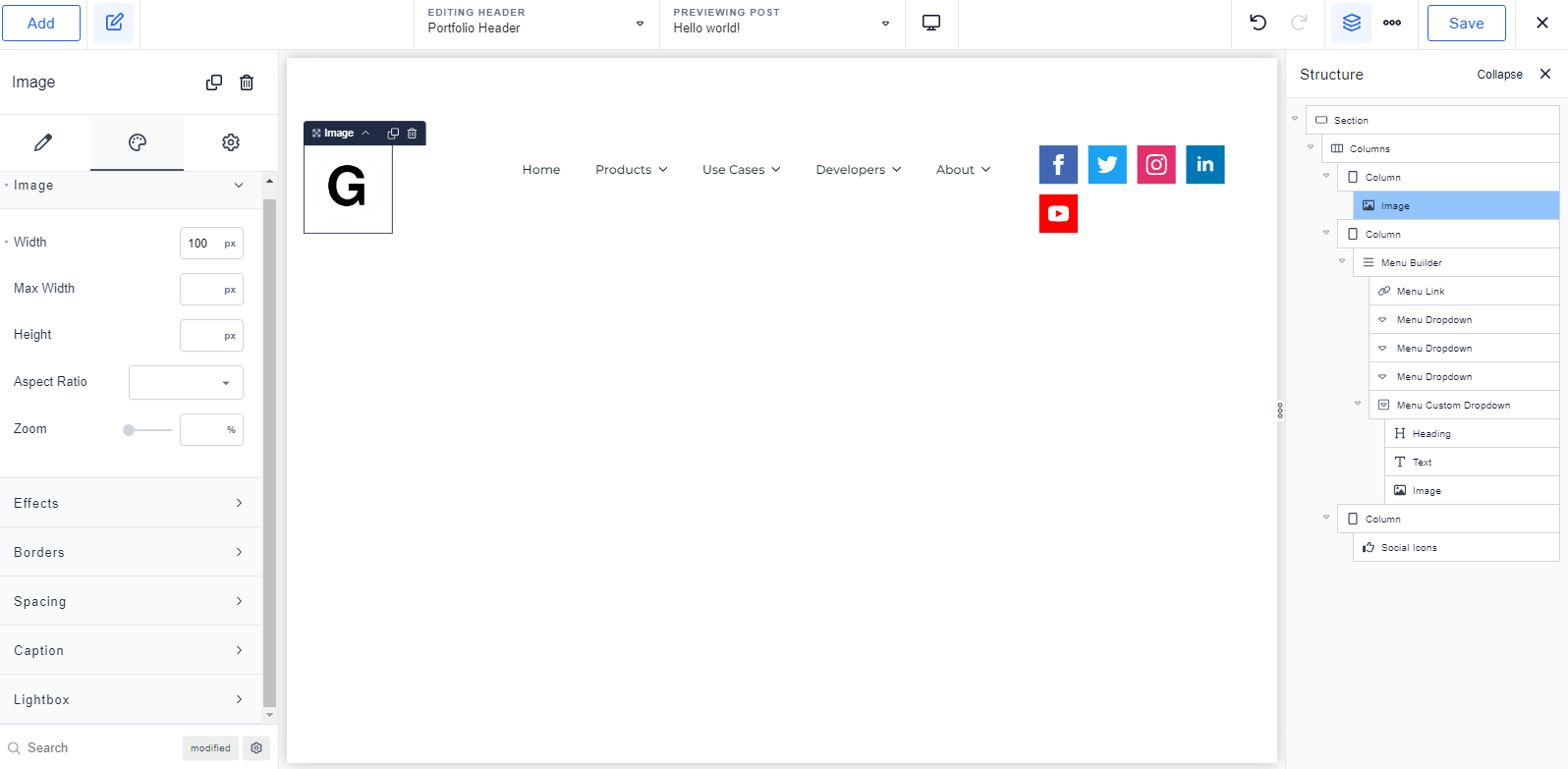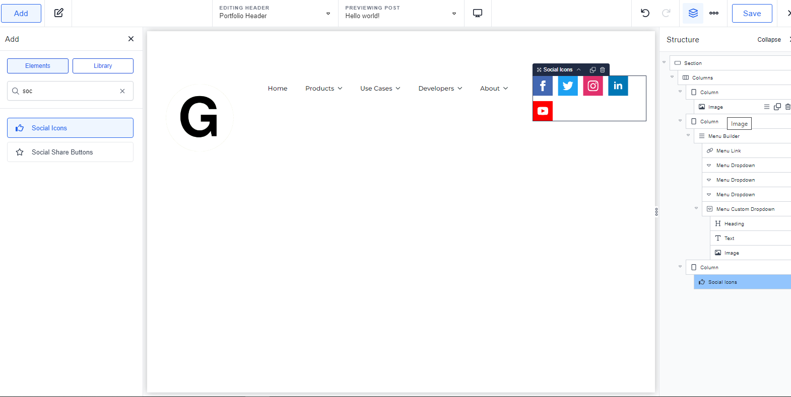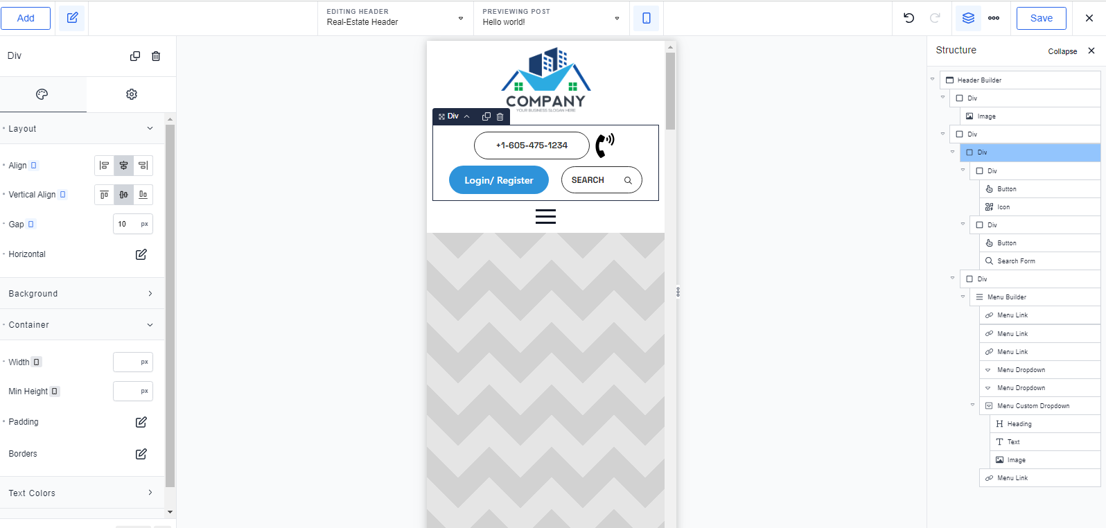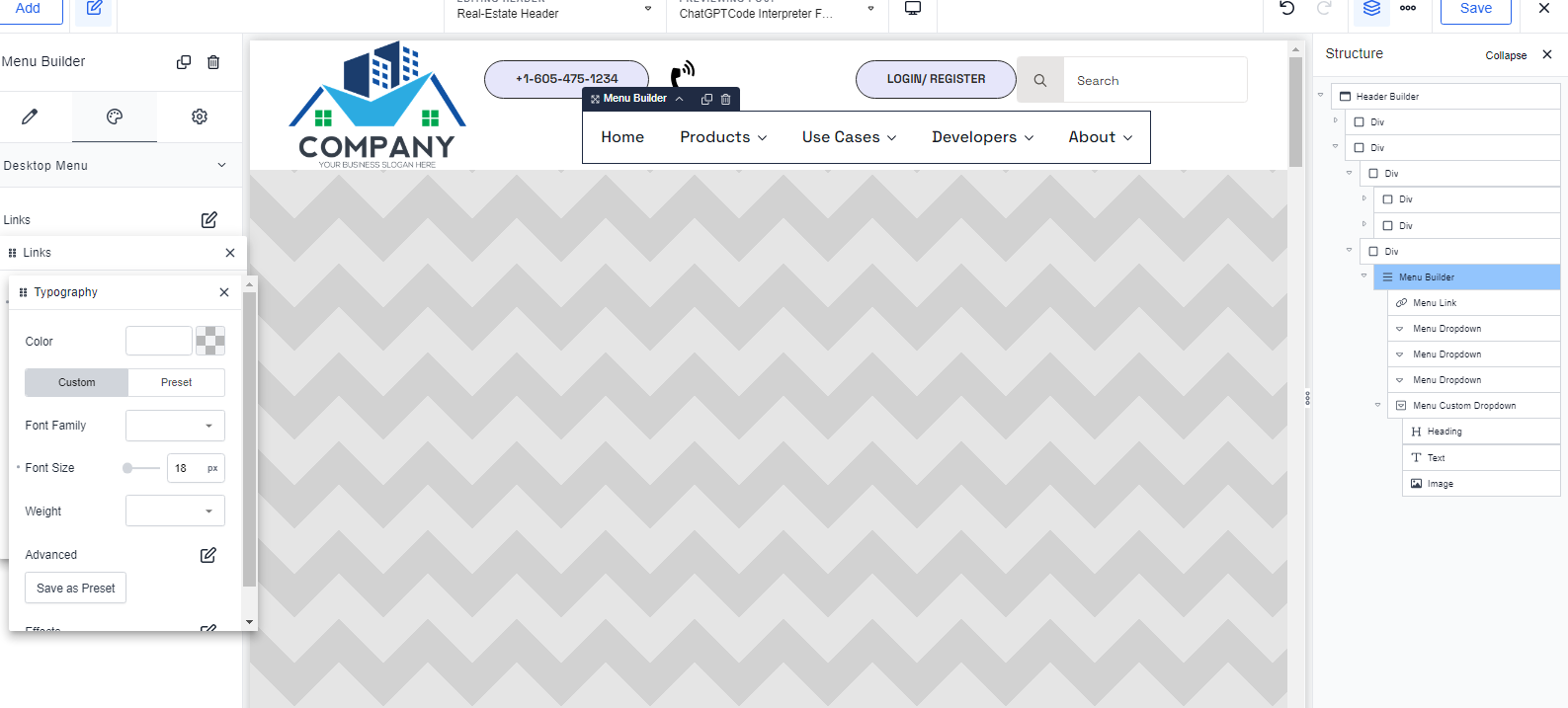 7. Let’s now add a menu. First, add another Div within the parent Div. Then, add the ‘Menu Builder’ element. Your header should look like this.