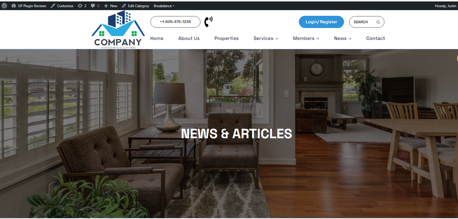 A header in real-estate websites often contains contact information, company logo, and menu for property listings.