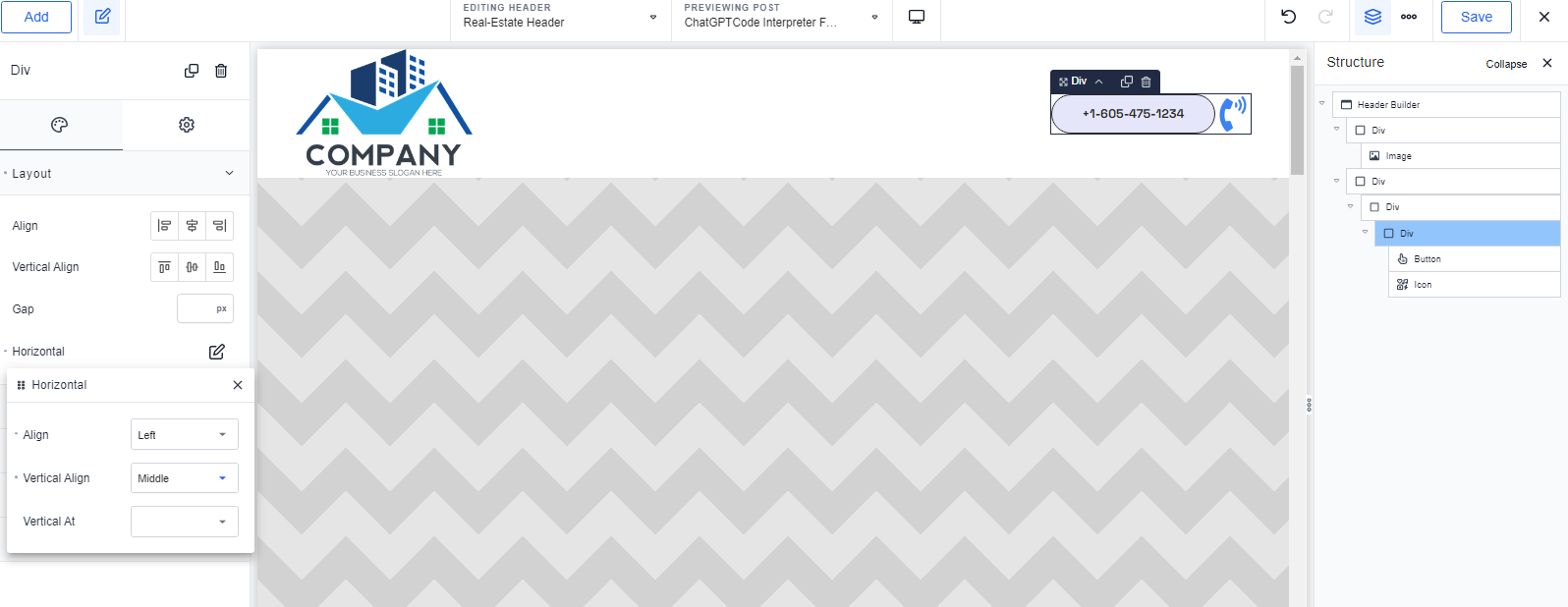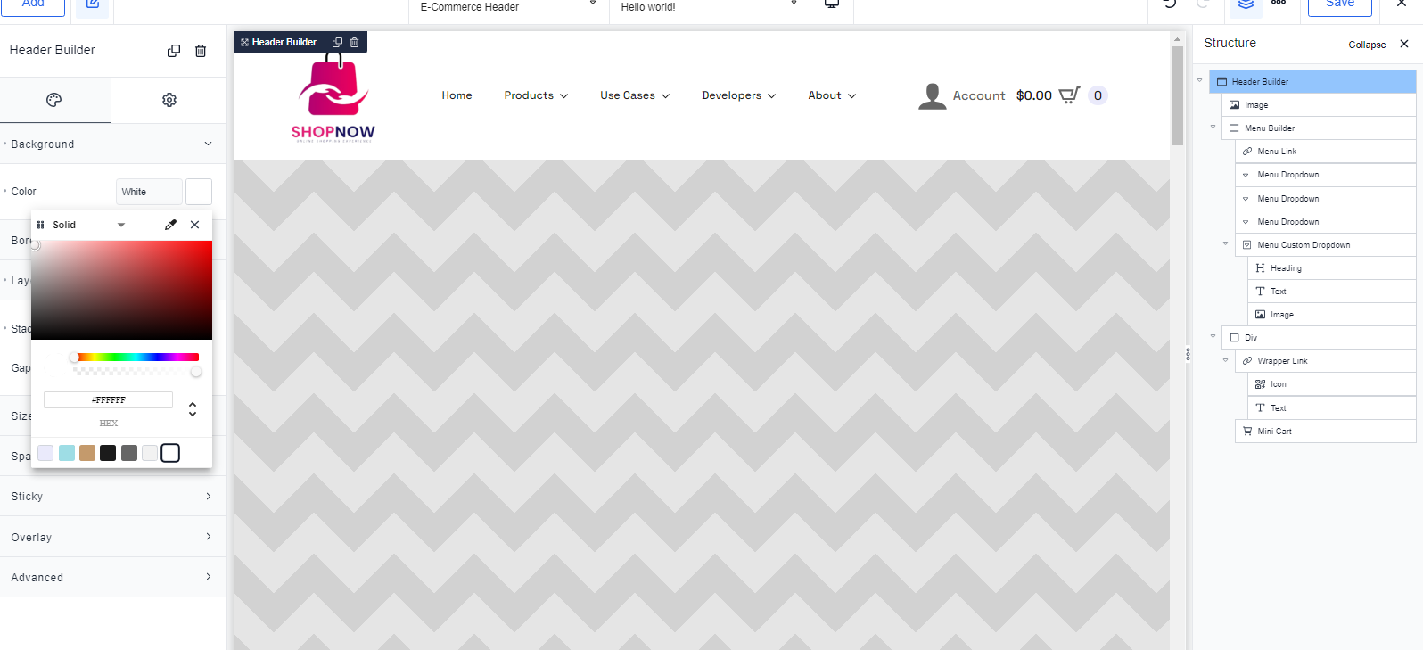 7. Within the ‘Header Builder’ element, adjust the alignments, background color, icon colors, and font sizes that fits your brand.
