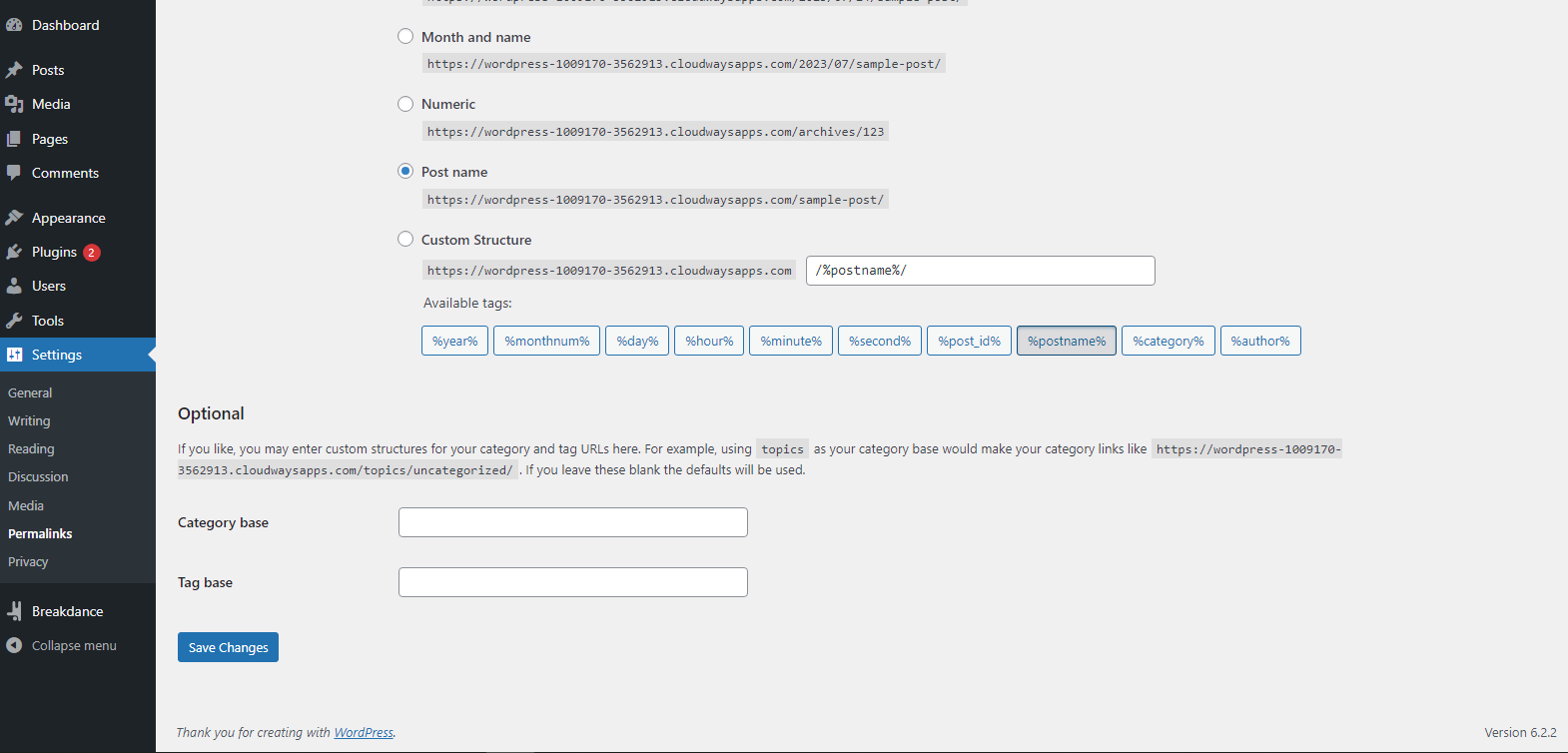 To solve this issue, navigate to Settings > Permalinks and click ‘Save Changes.’ Then, go back to your breakdance editor and refresh the page. The error message should now be gone.