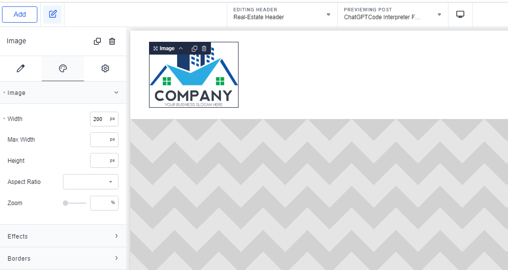 3. On the first Div, add your company logo. To adjust the image width, go to Style tab > Image and enter the width value.