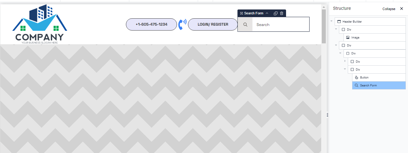 2. Let’s structure our layout. First, we’re going to need two Divs within our header section. The first div will be for the logo. The second div will contain the contact number, user login, search bar, and menu builder.