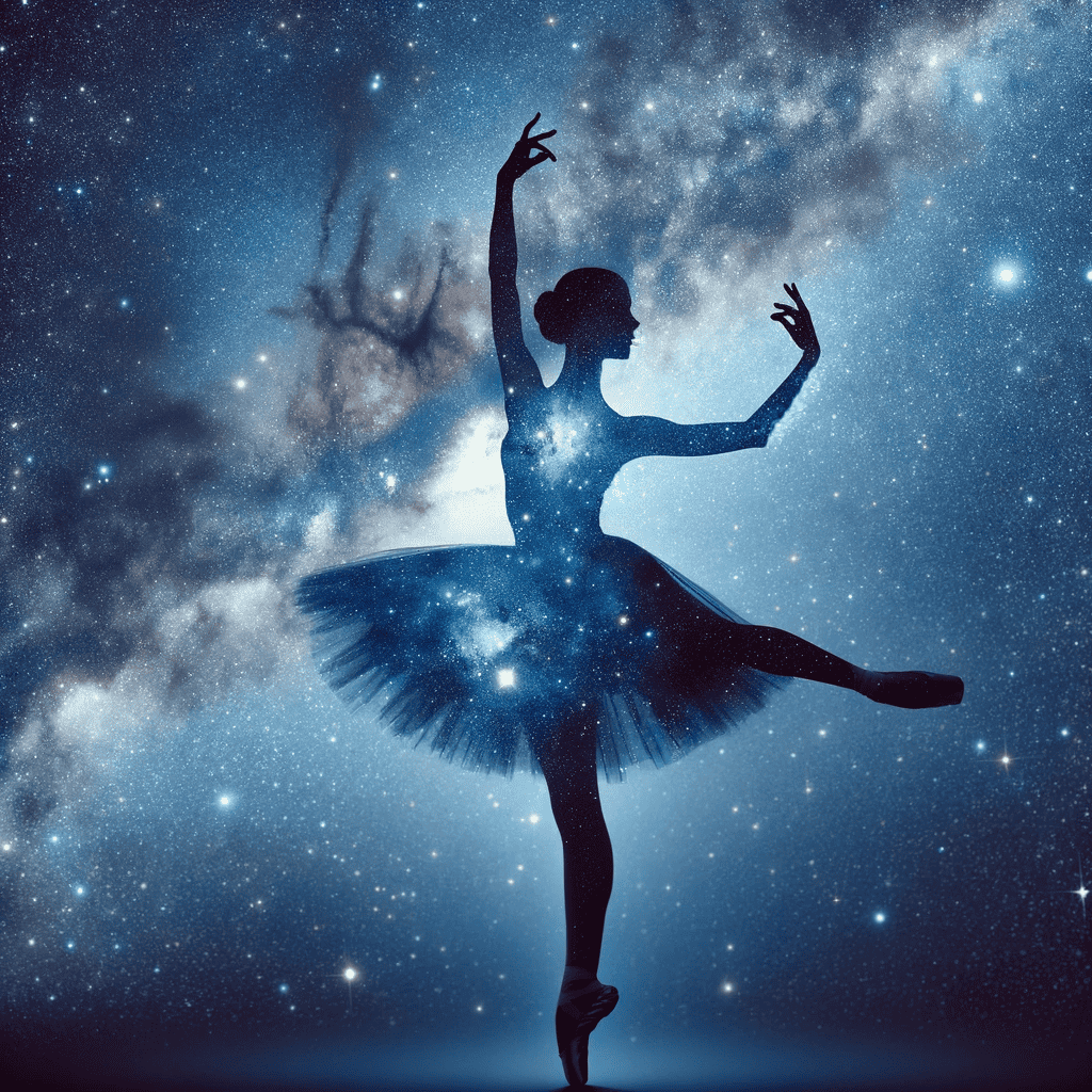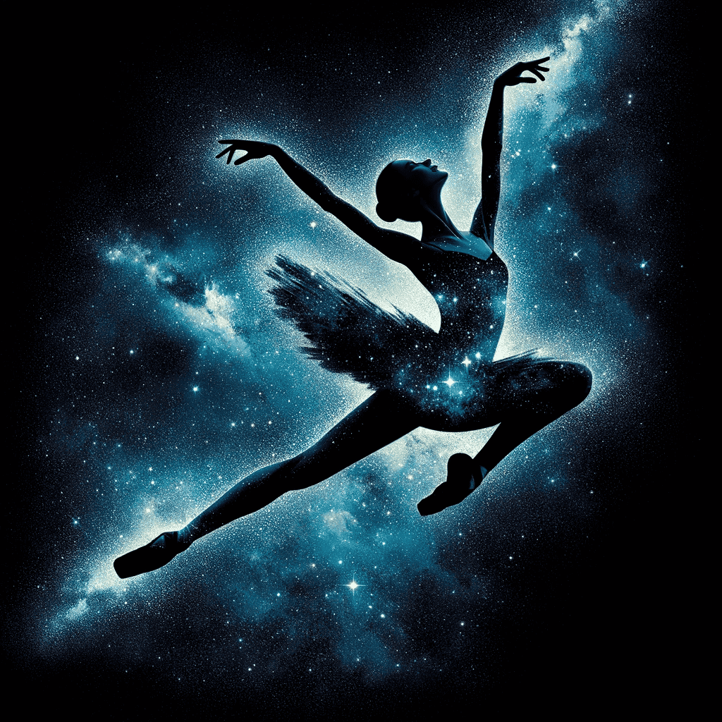 Prompt: A silhouette of a ballerina superimposed with a starry night sky.