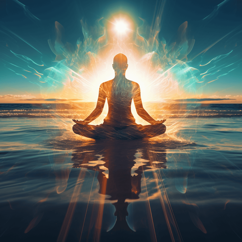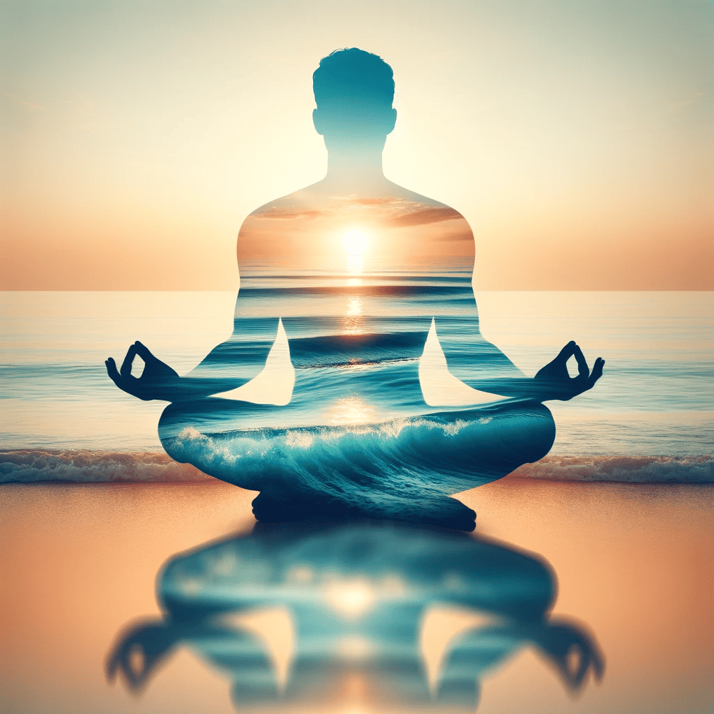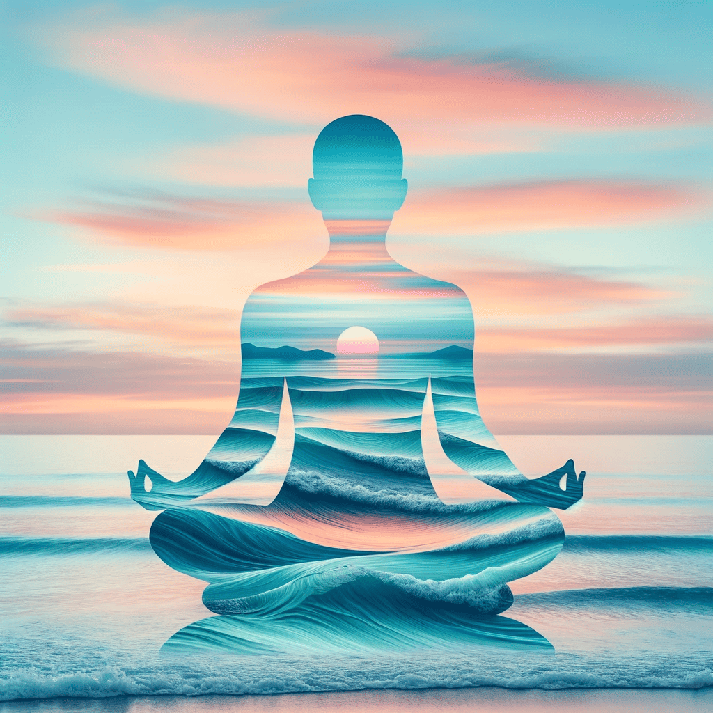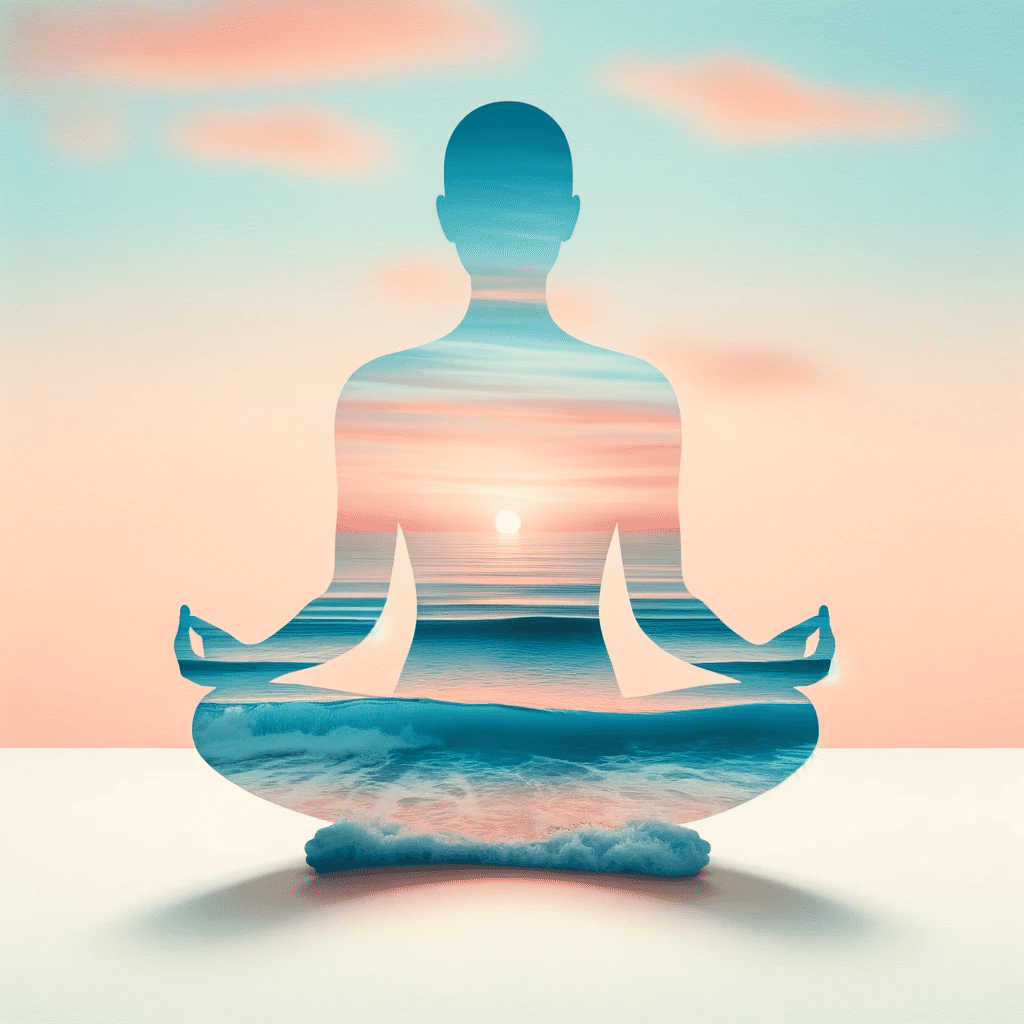 Prompt: A calm ocean scene superimposed into the silhouette of a meditating person.