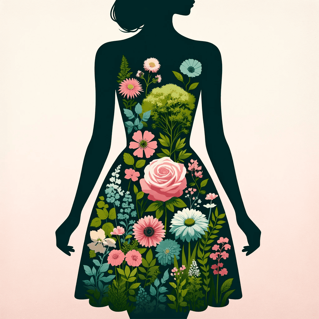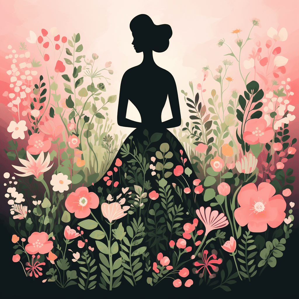 Prompt: A silhouette of a woman in a sundress superimposed with a garden.