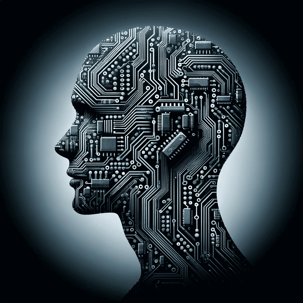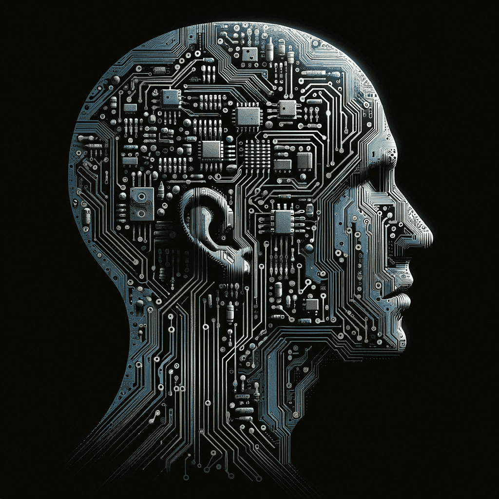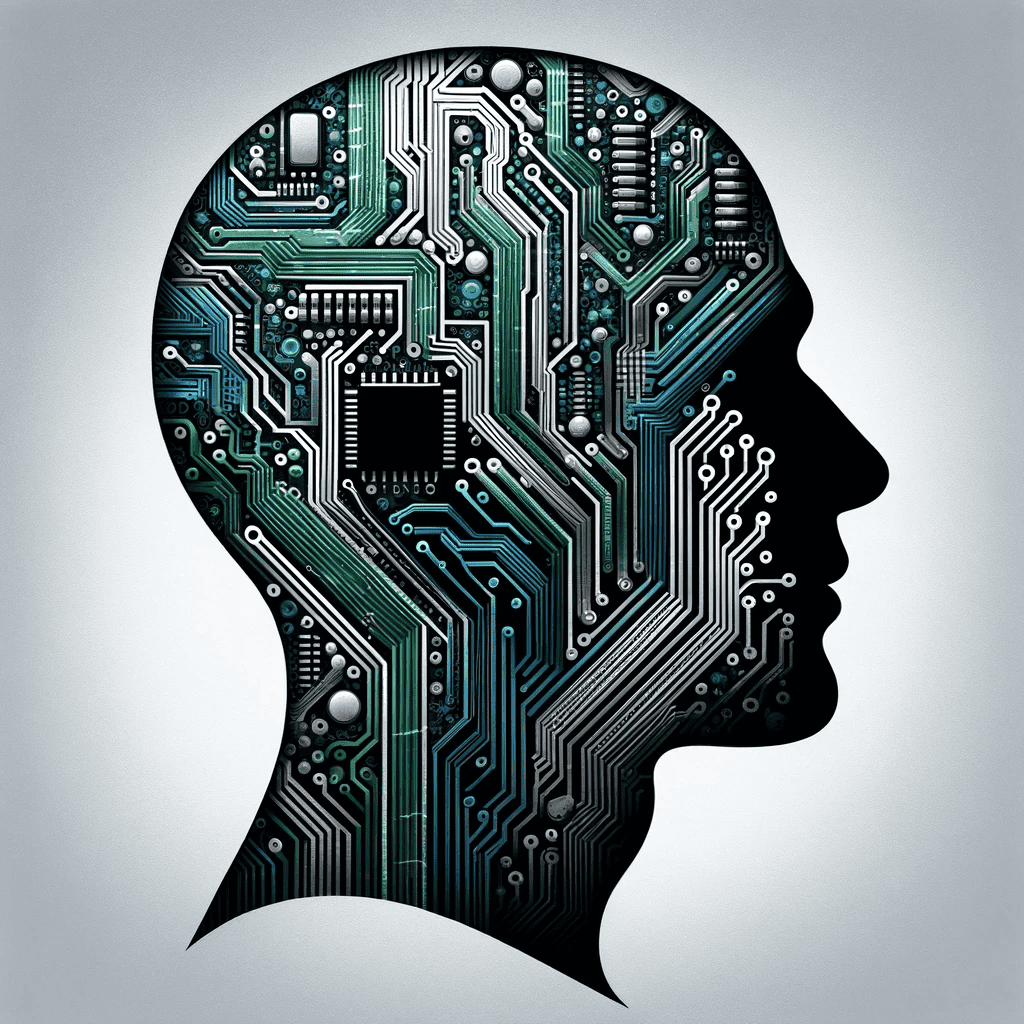 Prompt: A circuit board pattern superimposed into the silhouette of a human head.