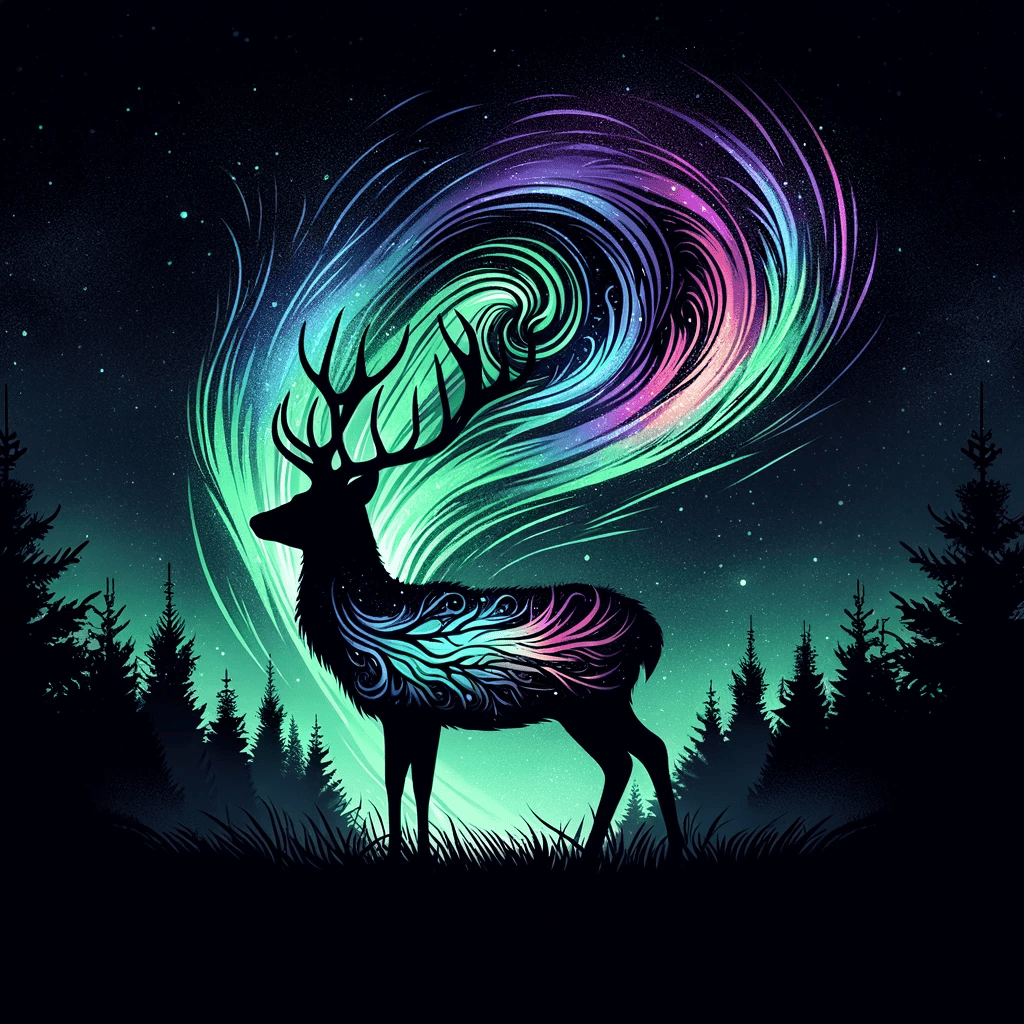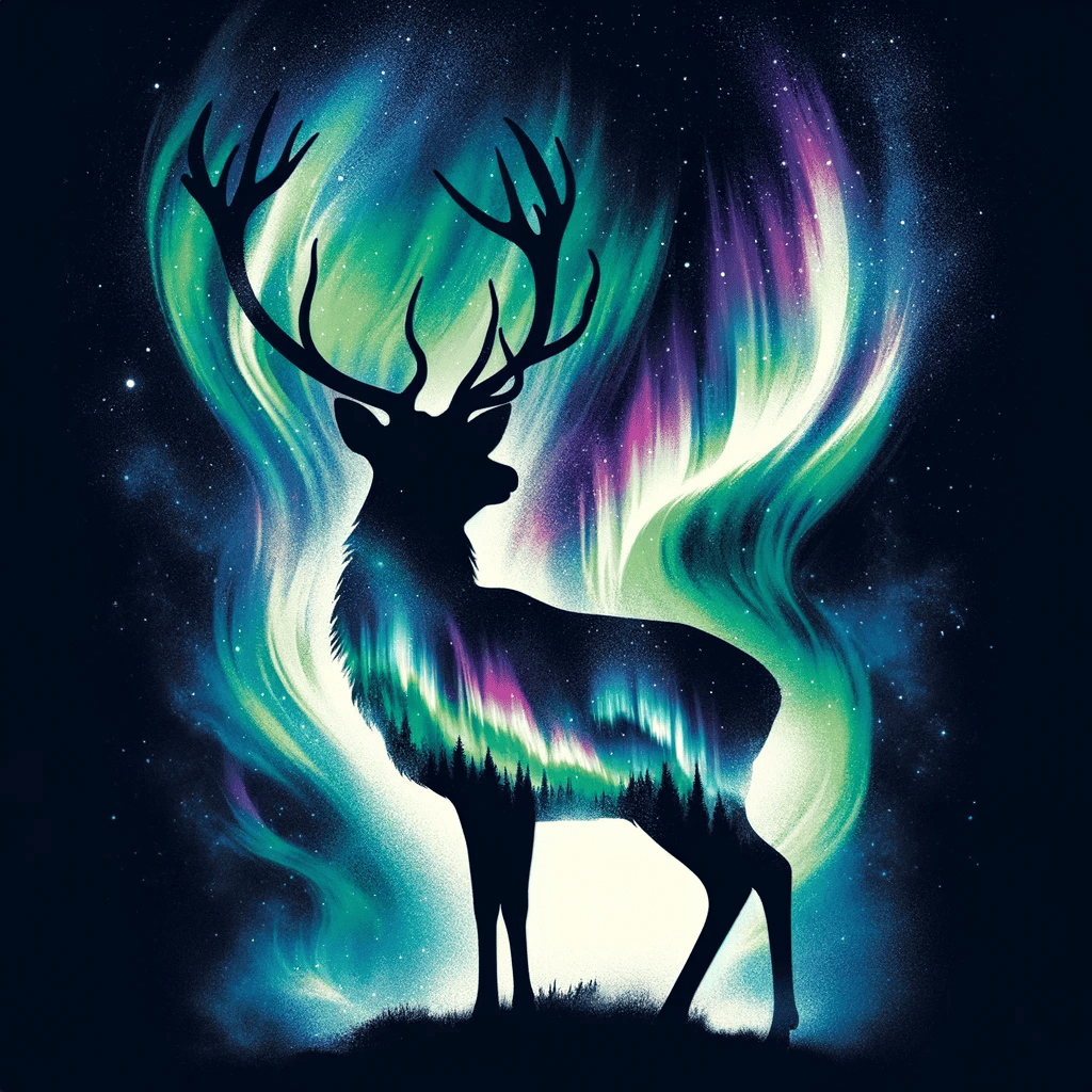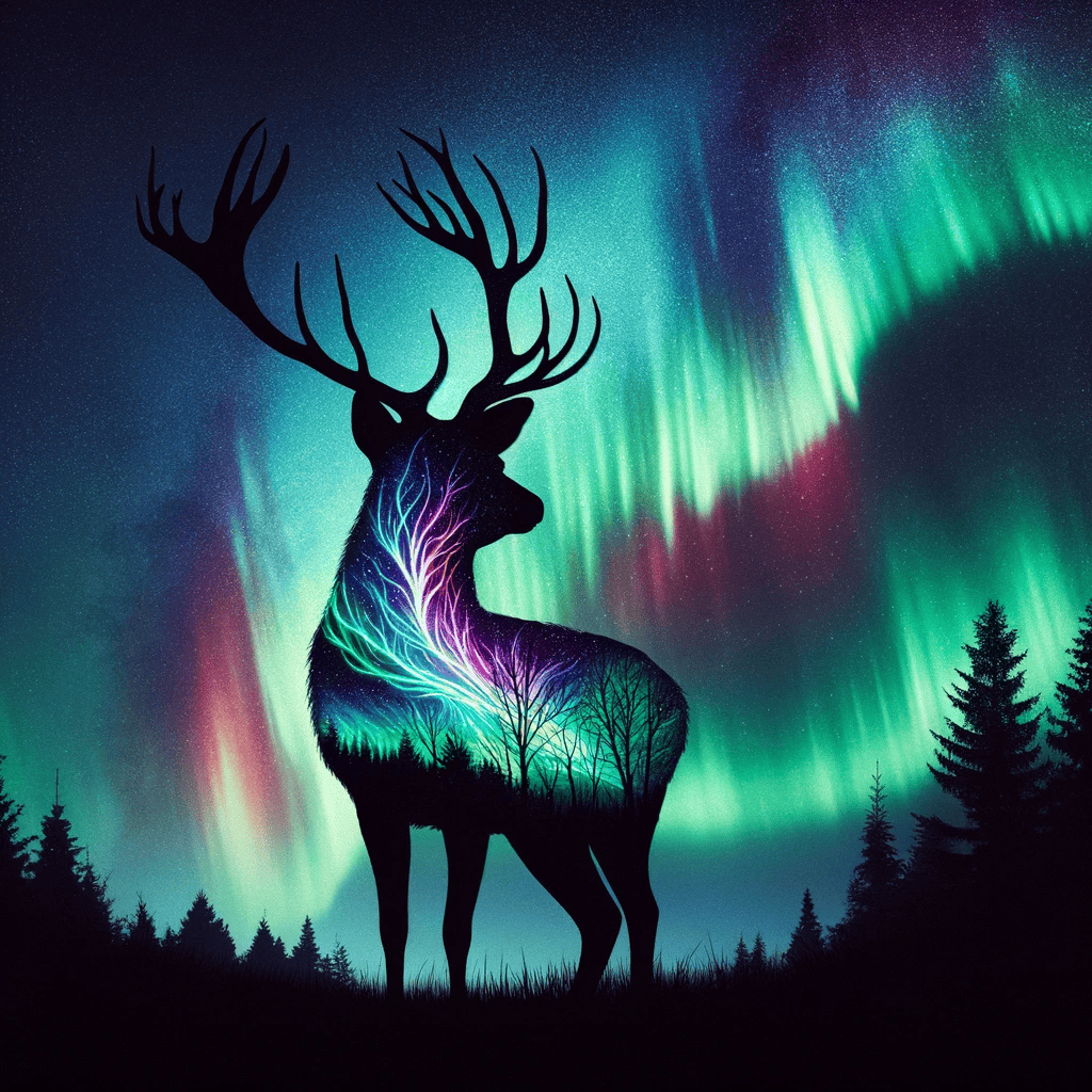 What about the mystical wonders of the world, like the Northern Lights? This prompt superimposes the enchanting glow of an aurora borealis with the silhouette of a deer, blending both magic and reality.