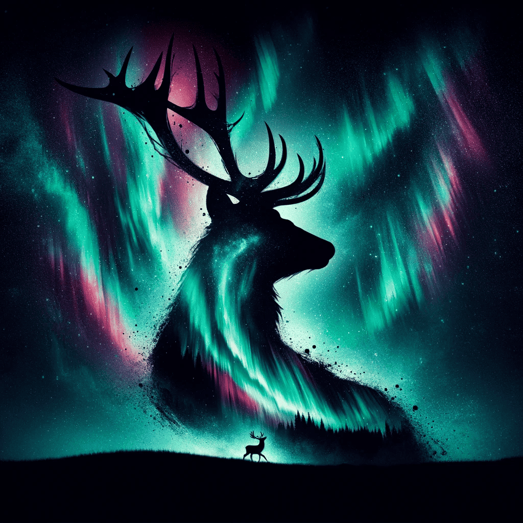 Prompt: The Northern Lights superimposed into the silhouette of a deer.