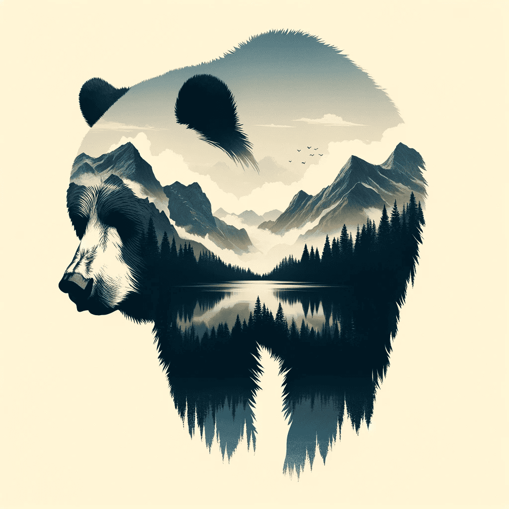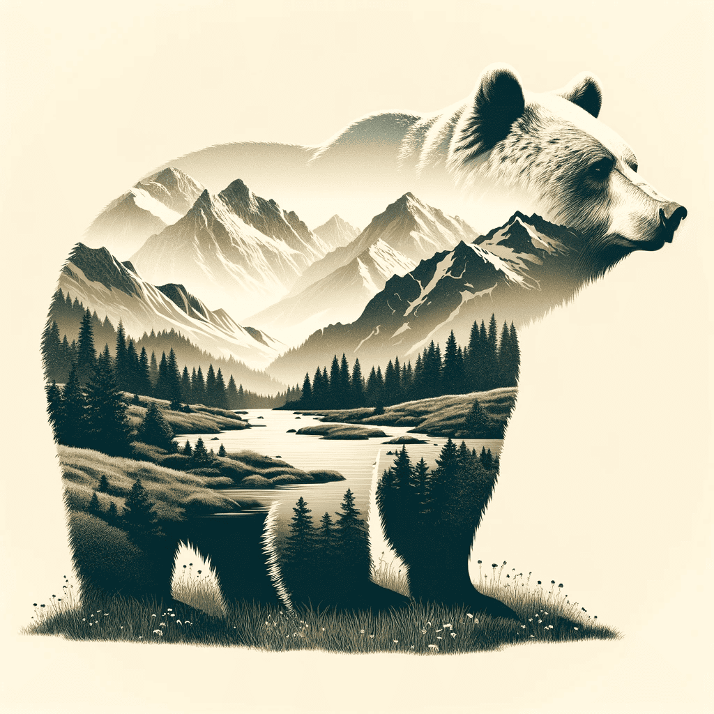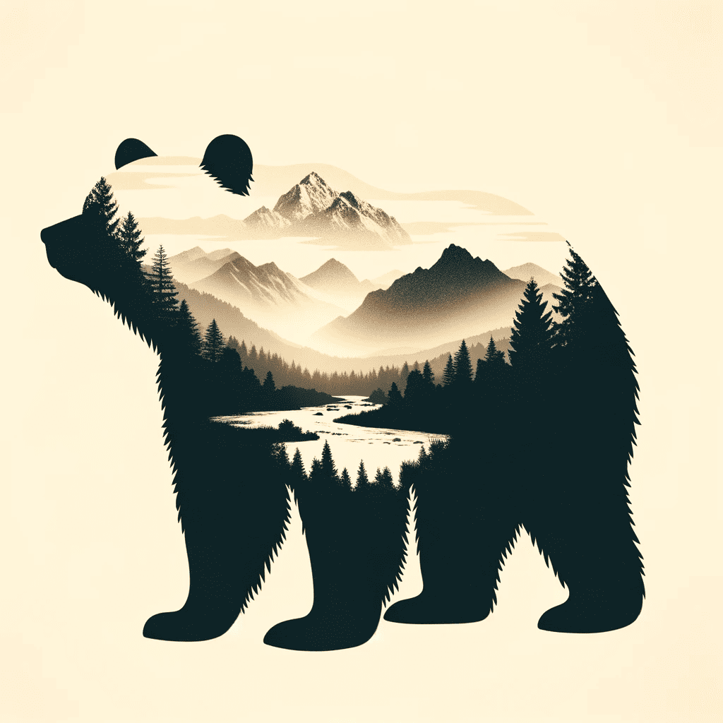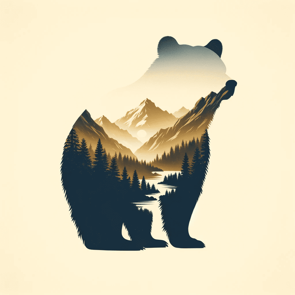 Prompt: Double exposure bear silhouette with mountain scene on cream background.
