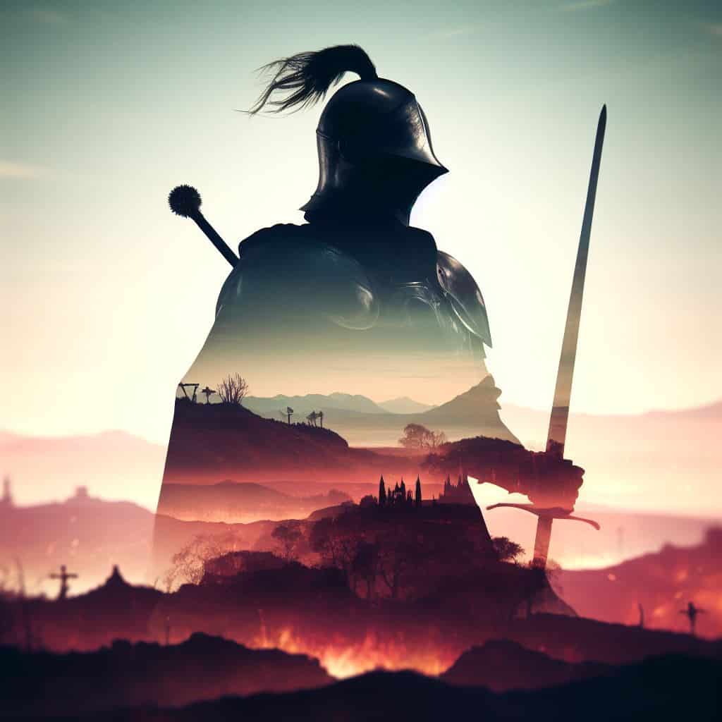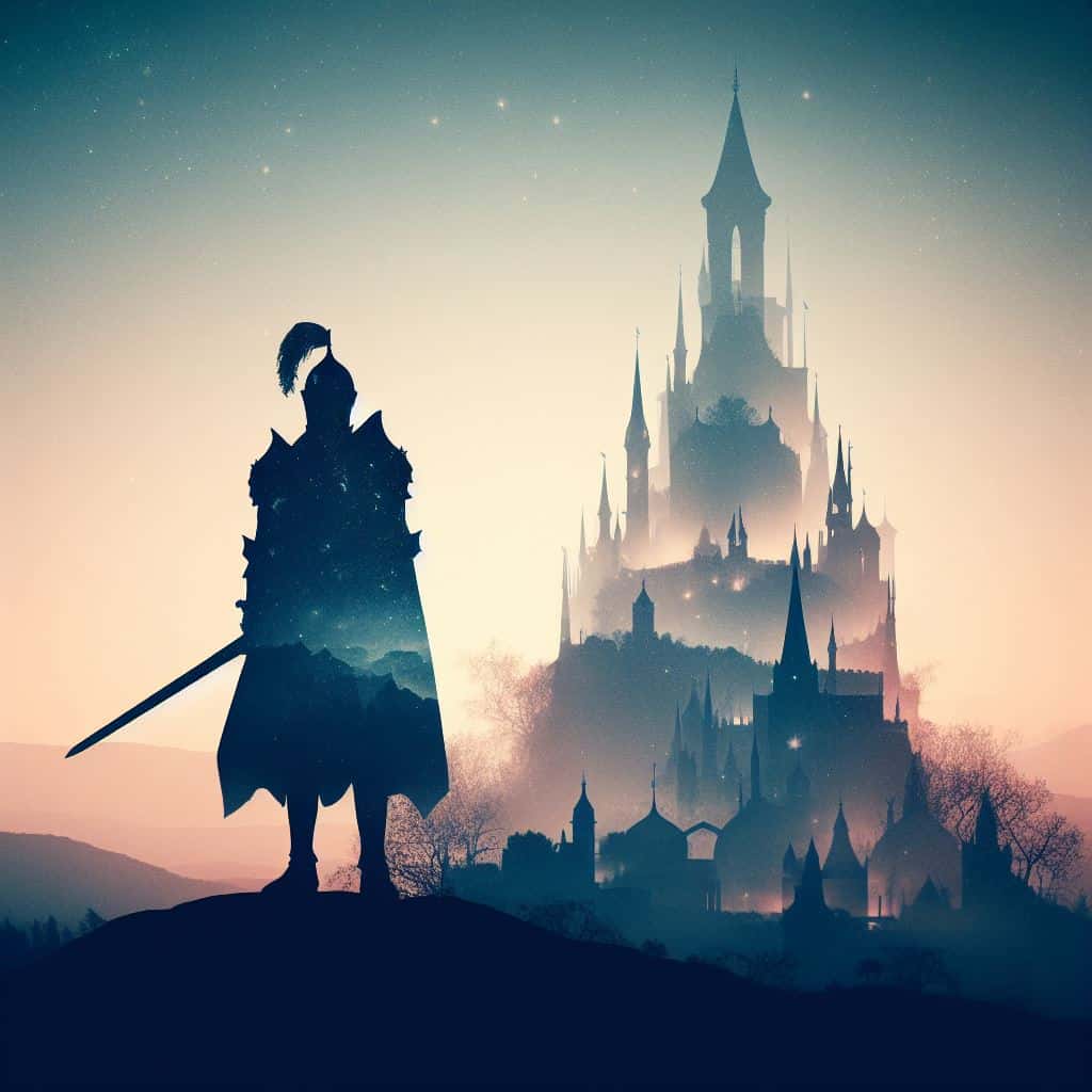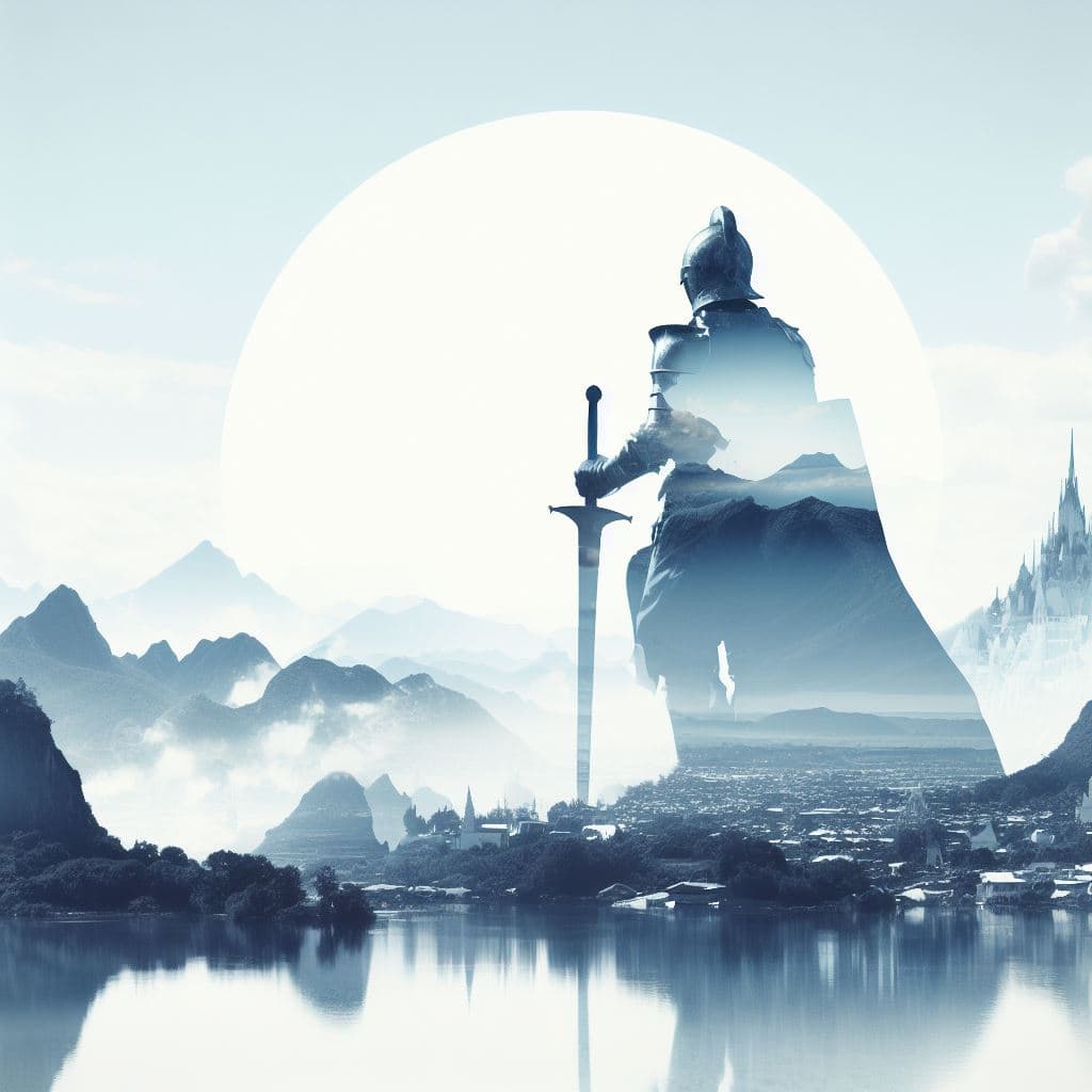 Prompt: Silhouette of a knight with a fantasy landscape double exposure.