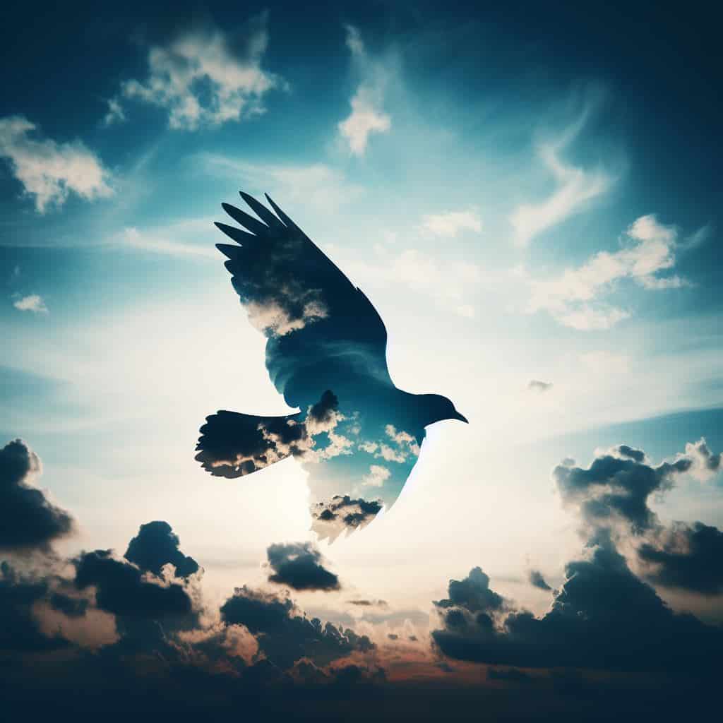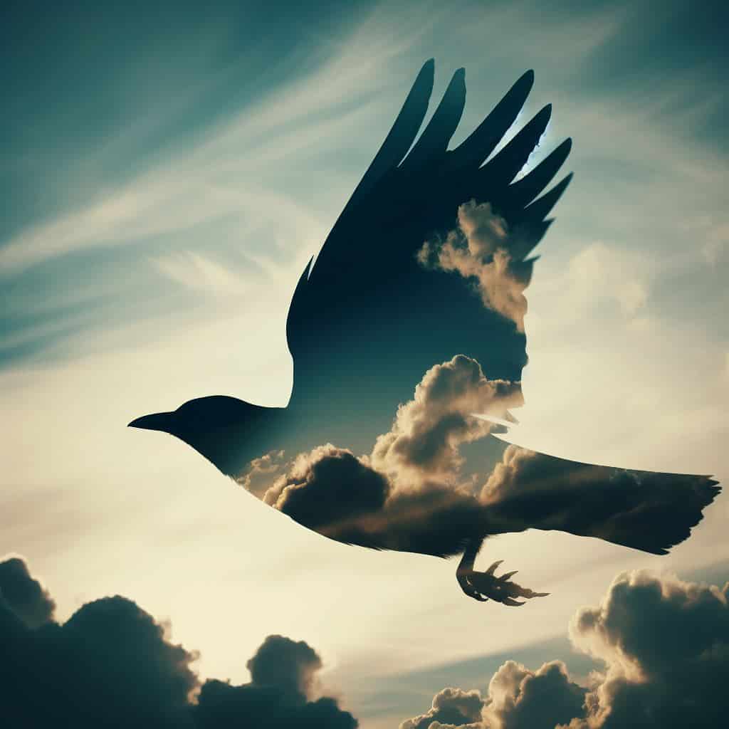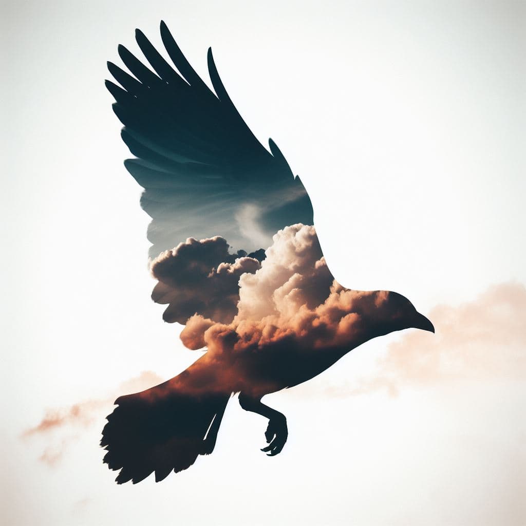 Prompt: Silhouette of a bird in flight with a double exposure of clouds and sky.