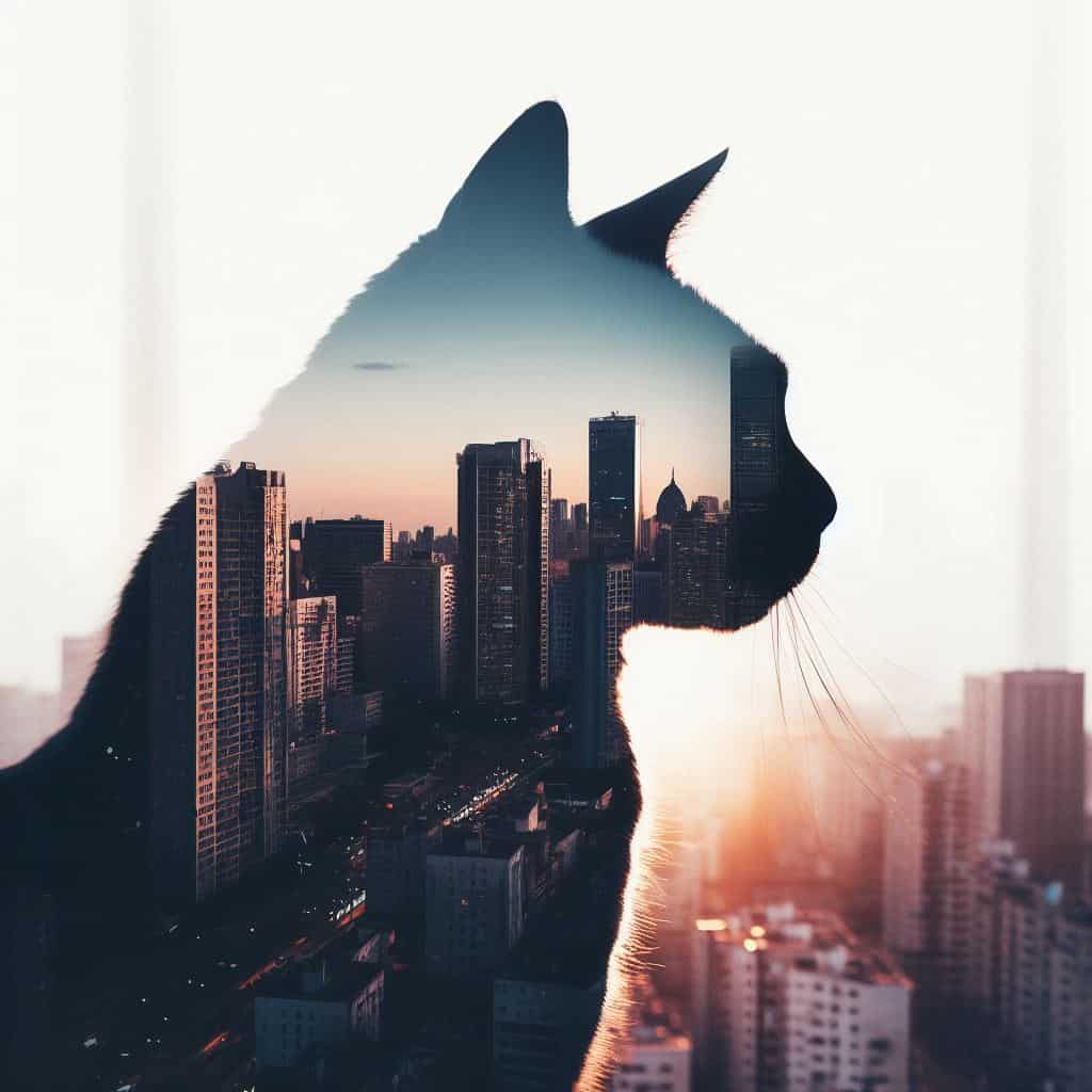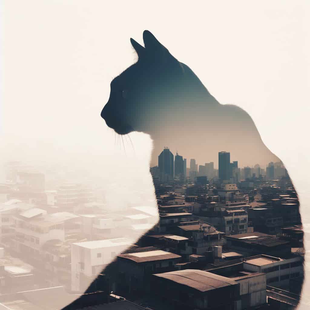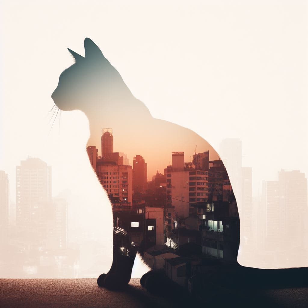 Prompt: Silhouette of a cat with a double exposure of an urban rooftop view.