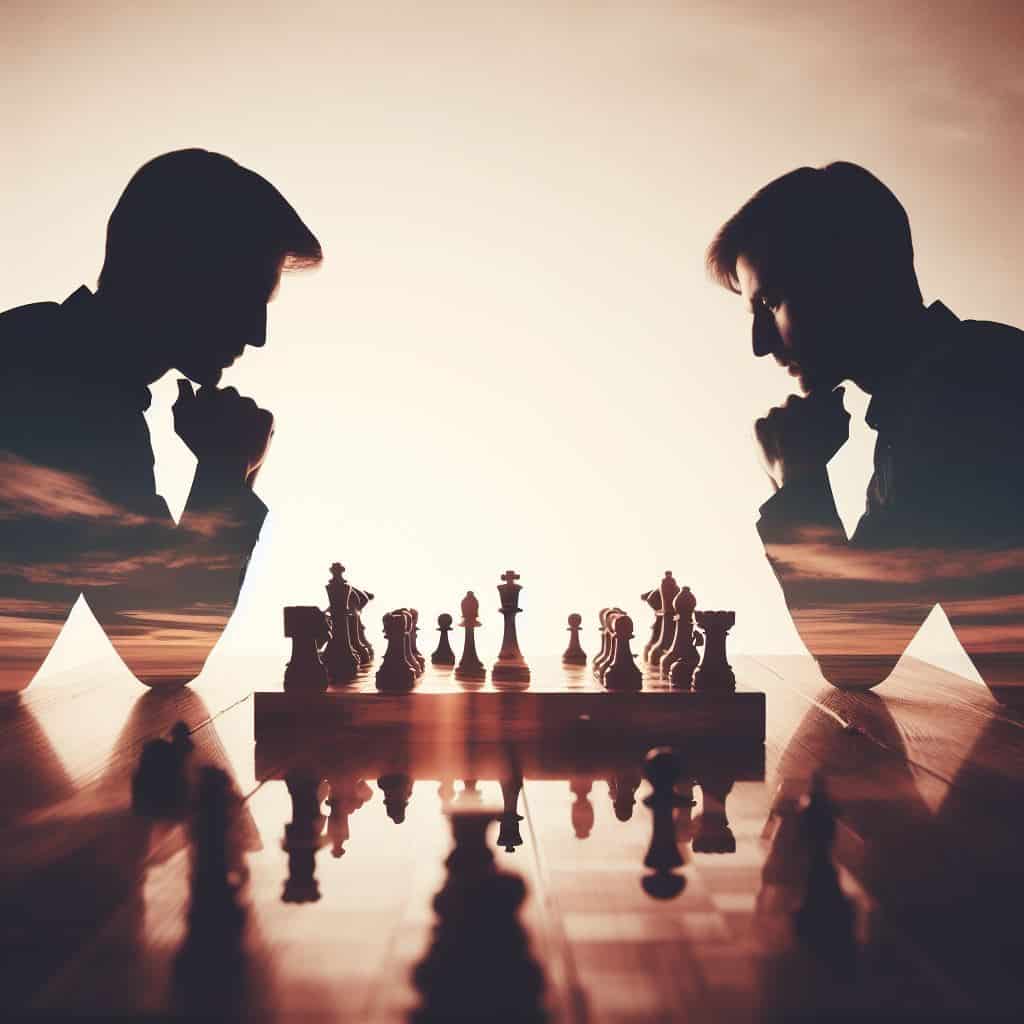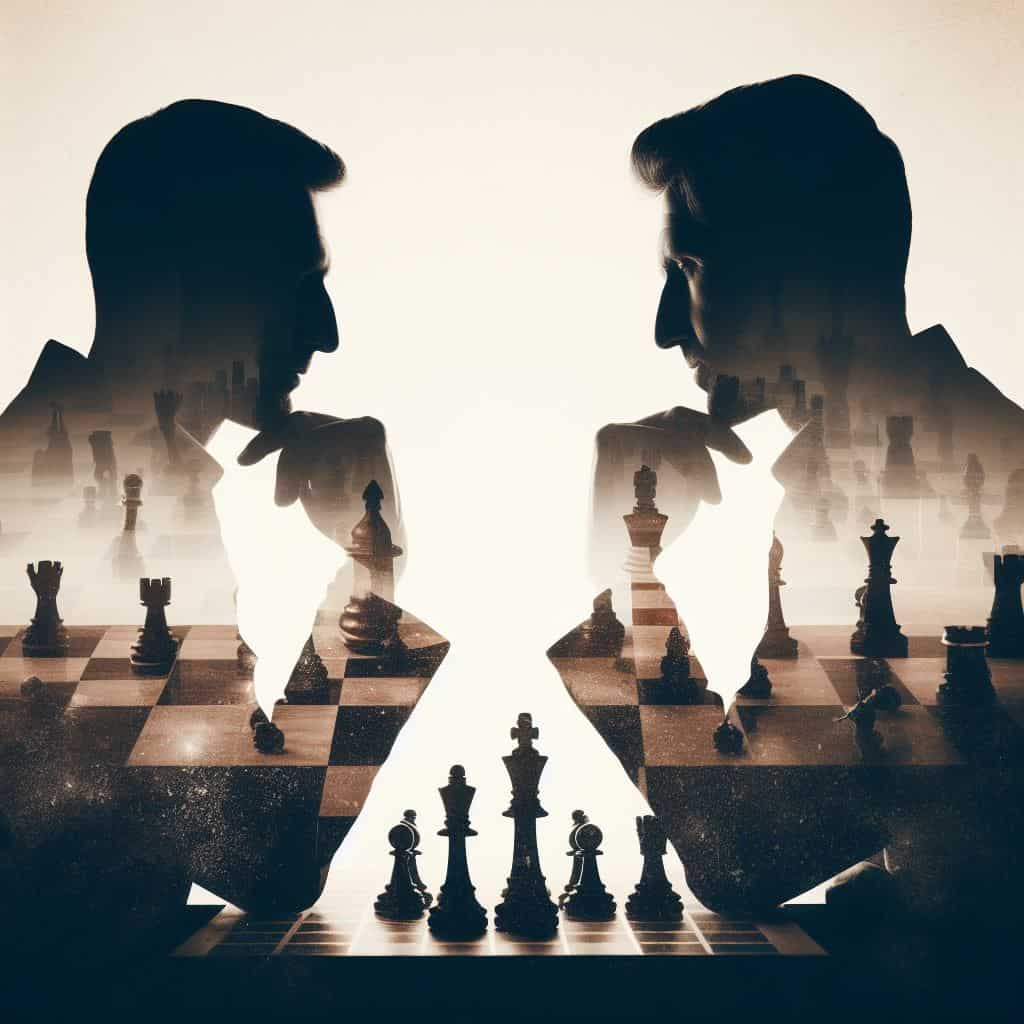 Prompt: Double exposure chess match of two players silhouette with a chess board.