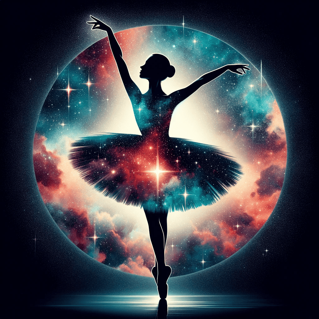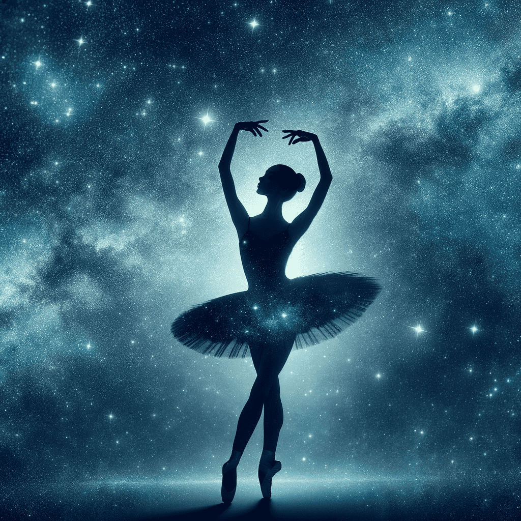 Prompt: A silhouette of a ballerina superimposed with a starry night sky.