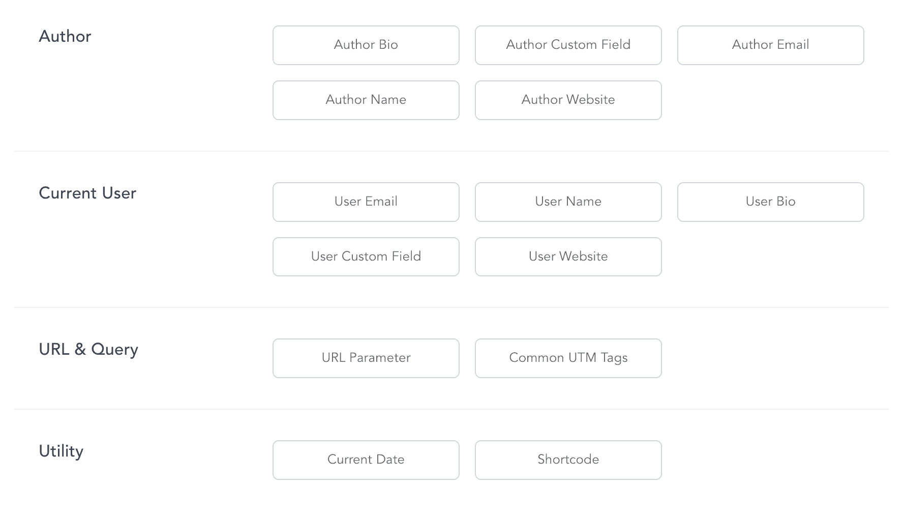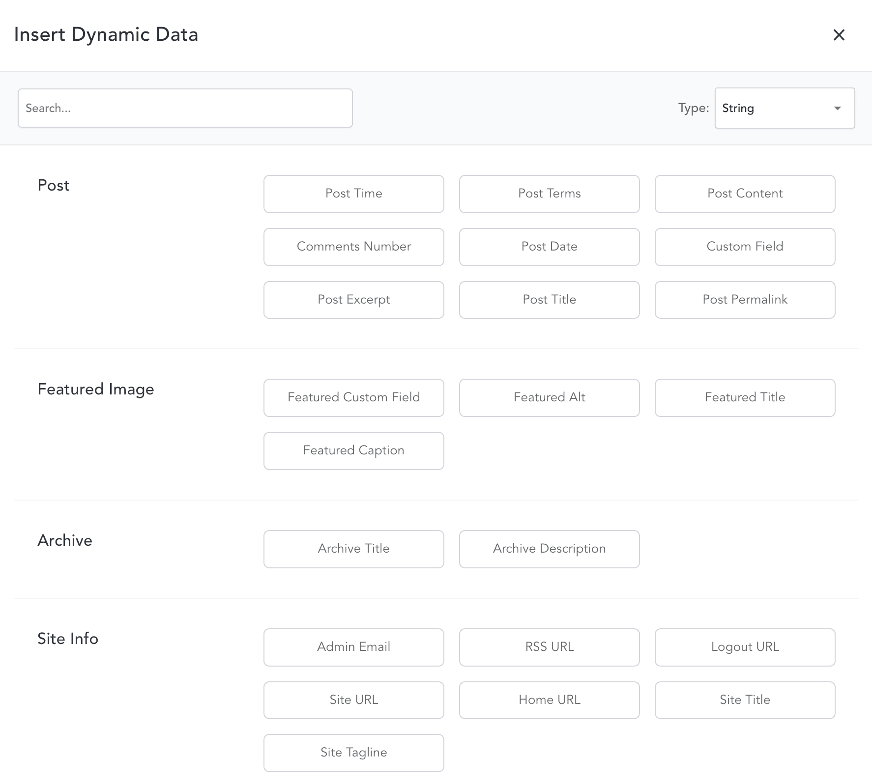 Breakdance supports tons of category types of dynamic data. These include: Post, Featured Image, Archive, Site Info, Author, Current User, URL & Query, and Utility fields.