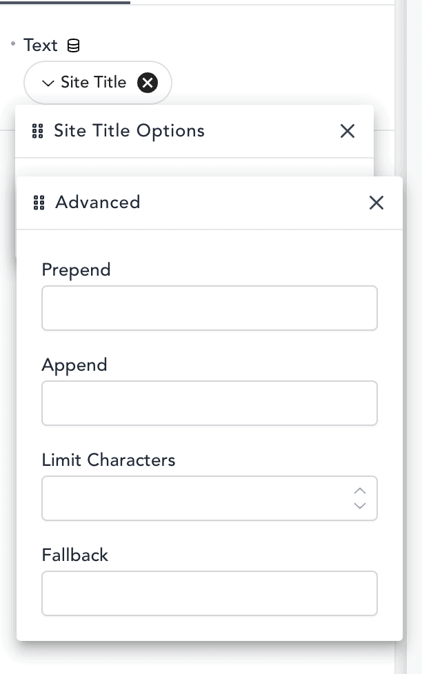 You also have a few options if you decide to click in. You can add text before and after the custom data (preprend/append), limit the total character count, or have a default message/data if what you're trying to pull is unavailible.