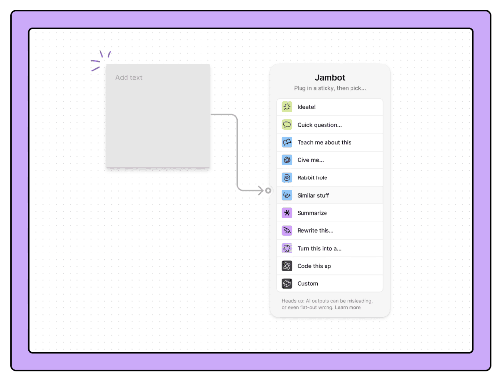 Jambot is a FigJam widget that uses the power of generative-AI to help users brainstorm, develop, and organize ideas with their teams.