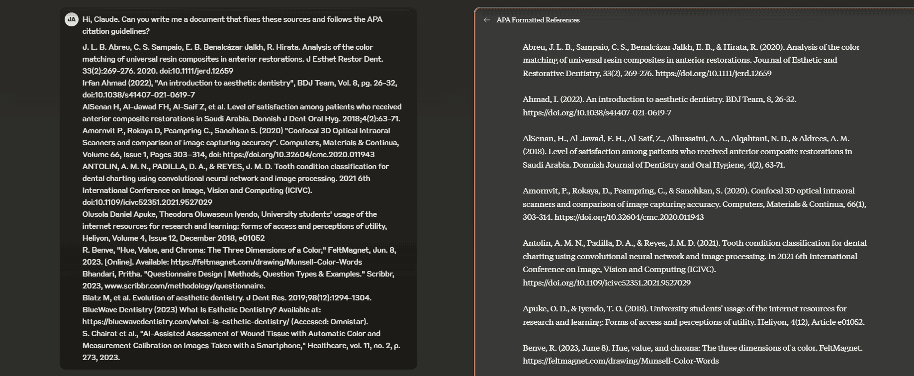 If you have a list but you’re pressed for time, you can let ChatGPT or Claude generate APA citations for your work. This would save you a lot of time, and is proof that AI and humans can coexist and work together — instead of one having to replace the other.