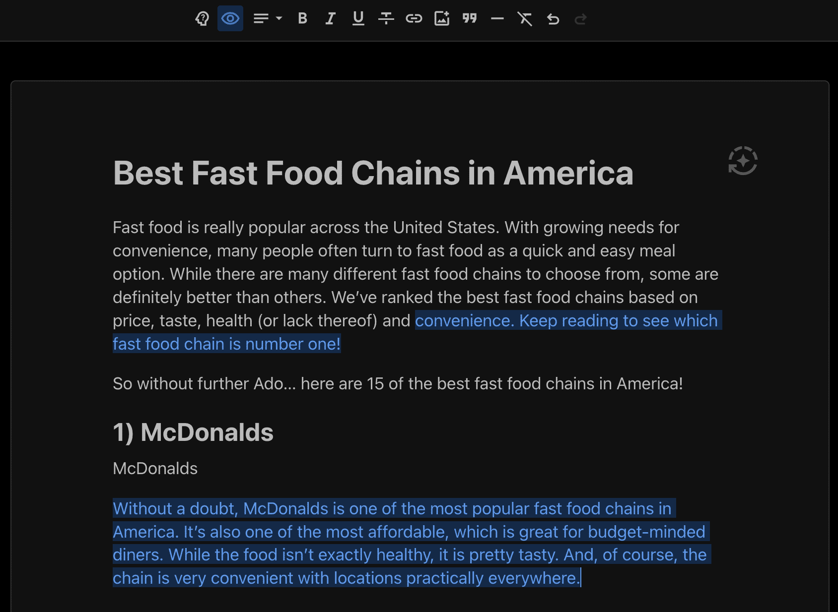 Lex also has a nifty feature to show you what text it wrote compared to what you wrote. This toggle is called "show AI hidden text" and looks like an eye in the toolbar.