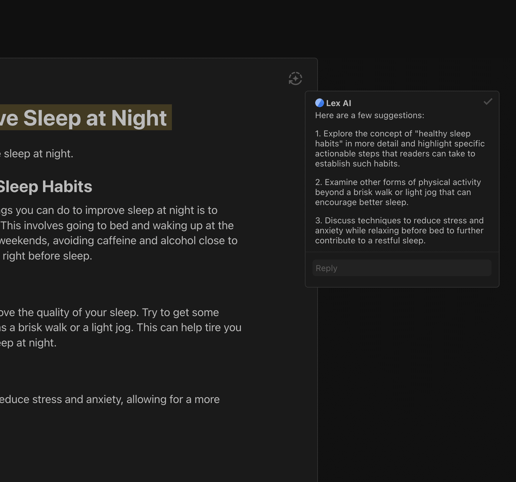 Need some assistance in the middle? Lex let's you highlight any part of your document and leave a comment @mentioning it. Ask any question you want. Perfect for brainstorming, re-writing, or writing even more