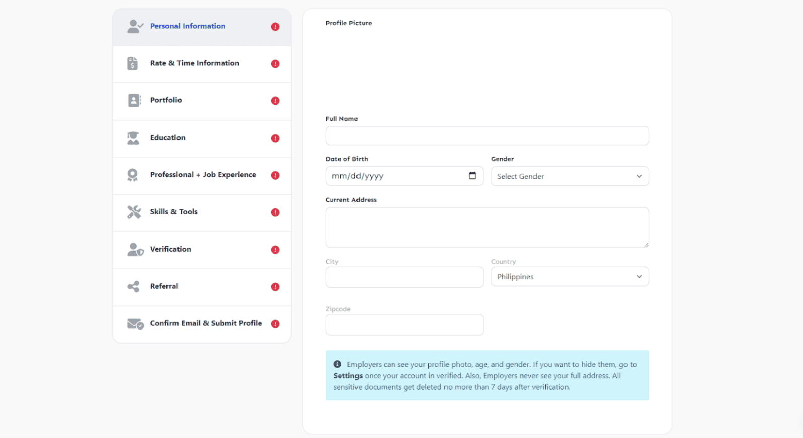 To register as a talent, you need to complete a profile that consists of your personal information, experience, education, portfolio, skills, and more.