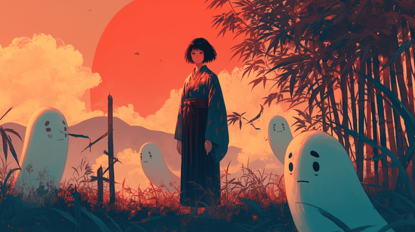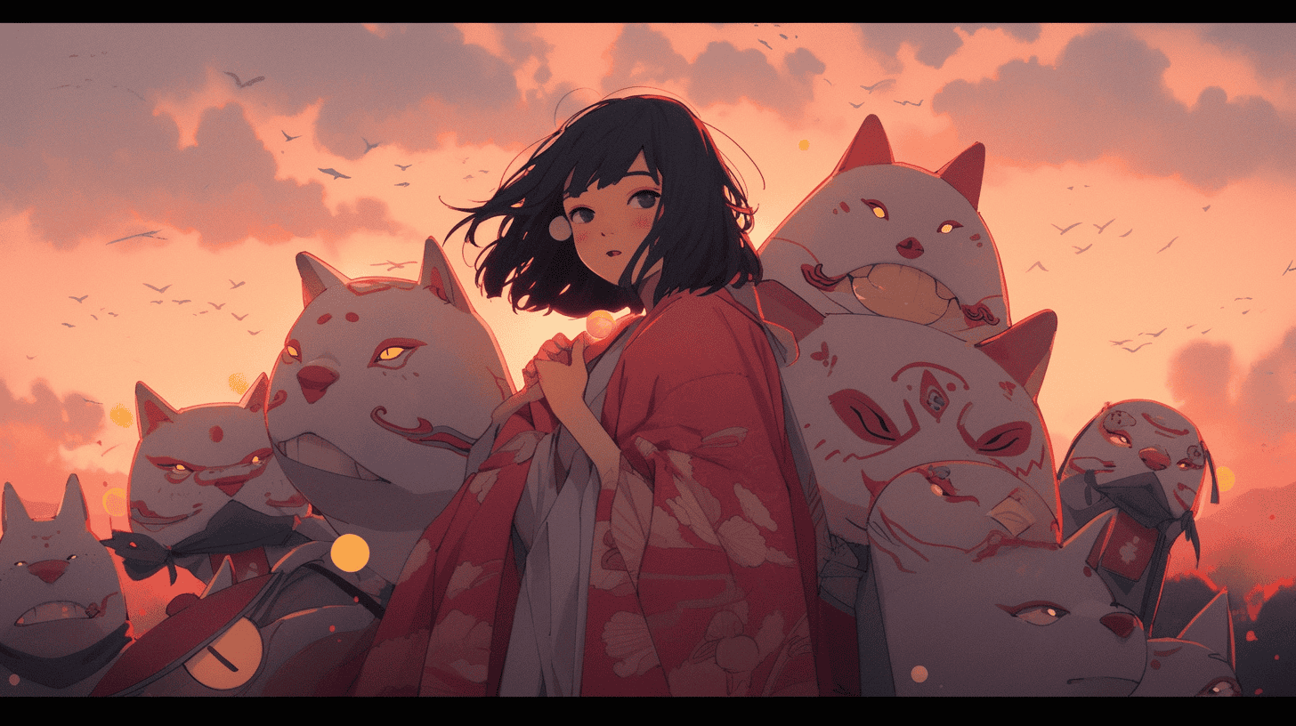 Prompt: a woman in a kimono and her spirit friends, whimsical, dusk, in the style of studio ghibli, cozy, minimalist