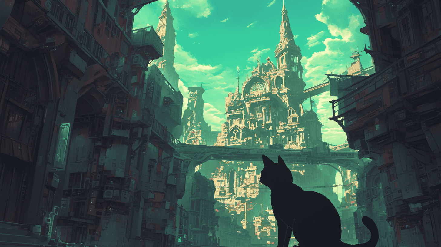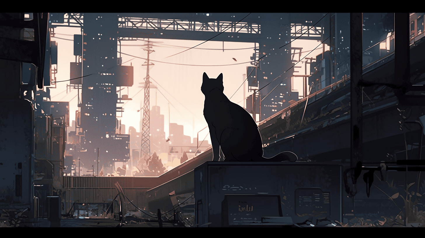 Prompt: a cat walks through a dystopian city, eerie