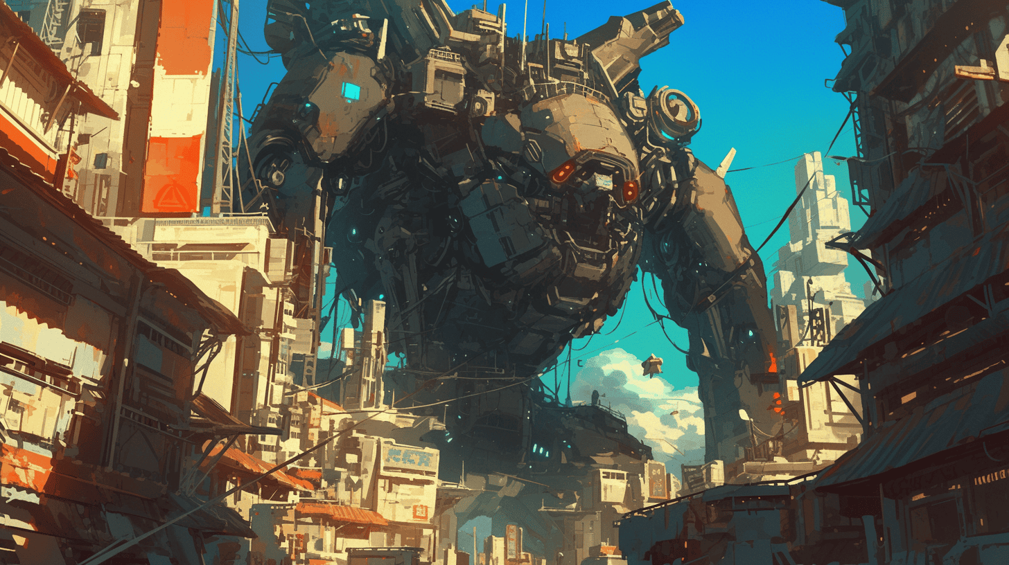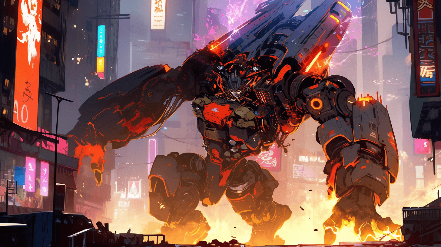 Prompt: an old beat up rusty robot terrorizing a neonpunk city, mecha anime