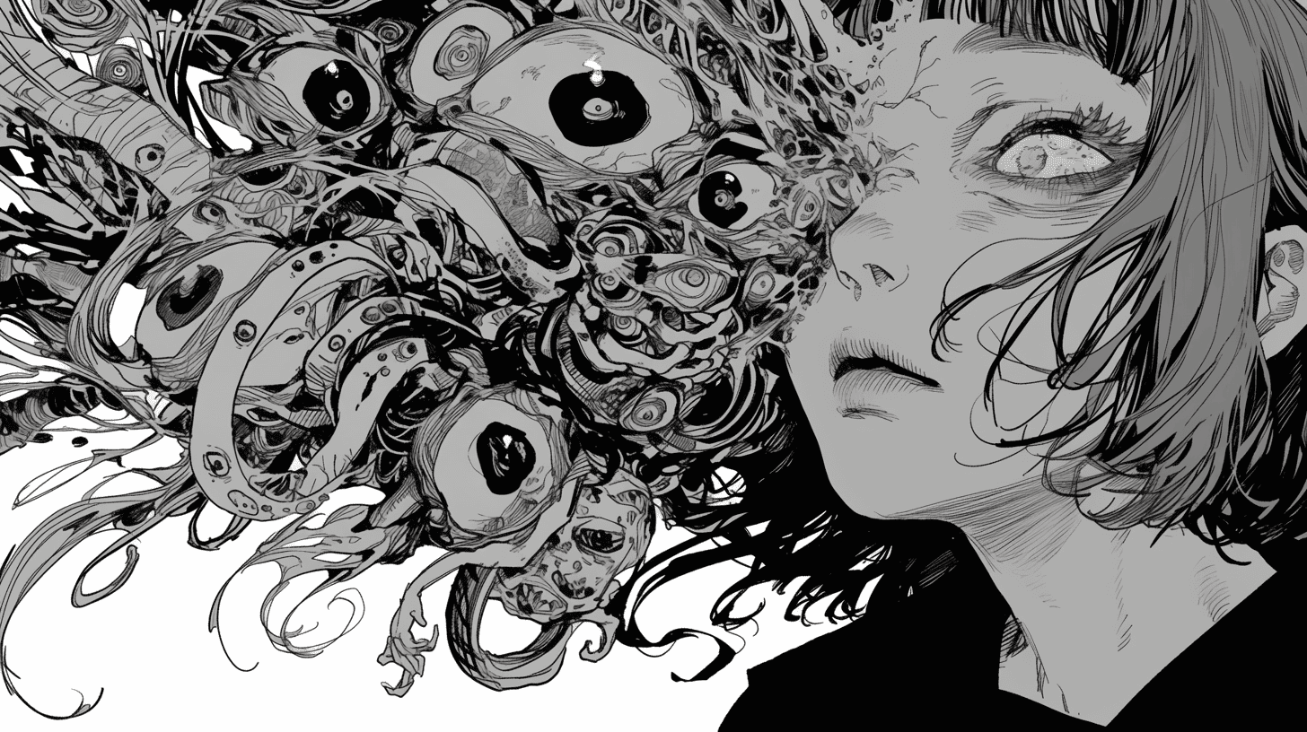 Prompt: a woman whose mind is slowly taken over by a shikigami, ominous, intricate artwork, in the style of junji ito