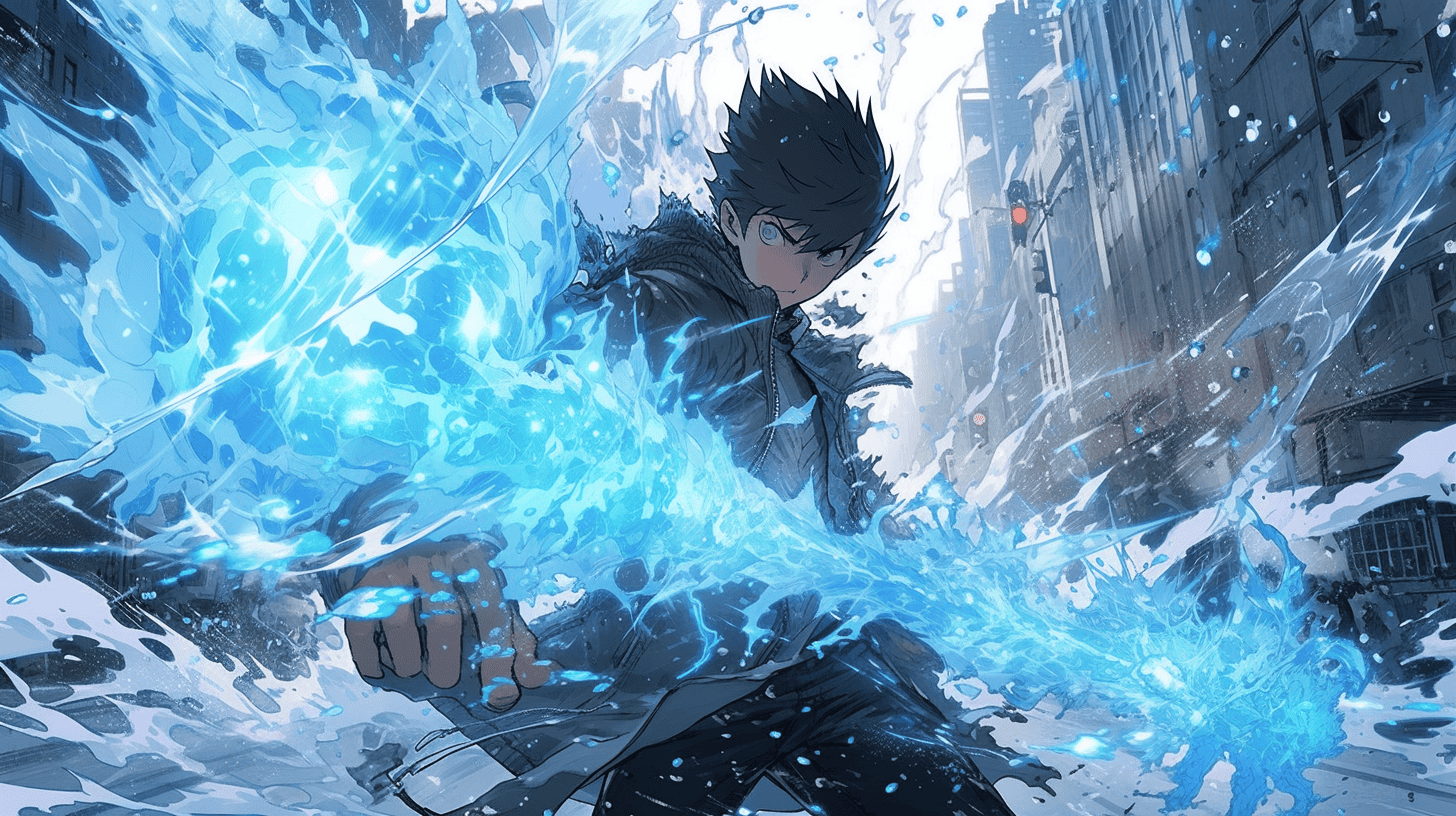 Prompt: a teenager using his powers to control ice, steampunk setting, intricate, in the style of jujutsu kaisen