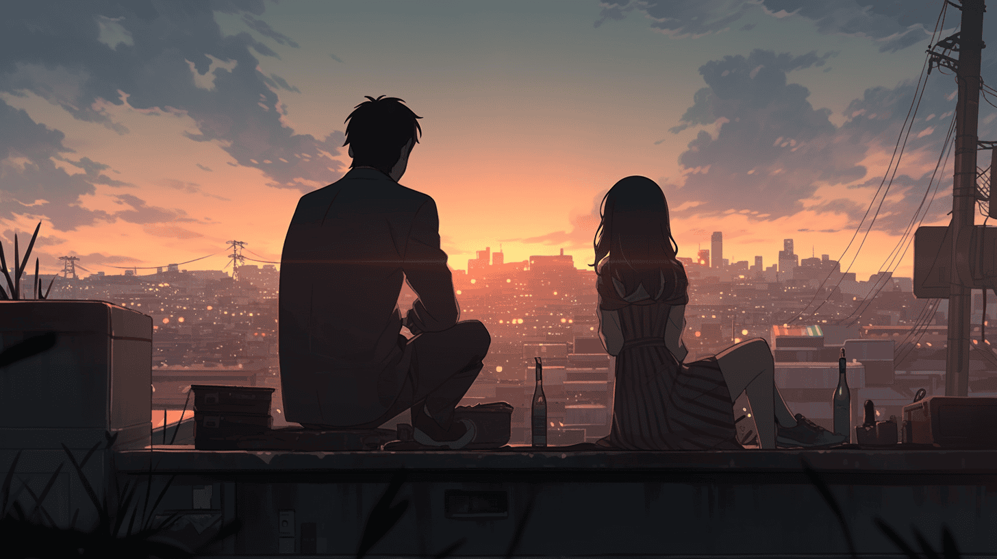 Prompt: a couple sits next to each other in a rooftop while watching the sunset, slice of life, in the style of makoto shinkai